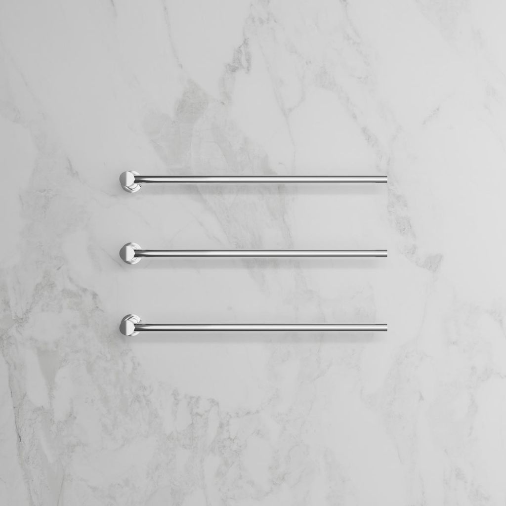 I horisontell modell med justerbara stänger som kan installeras i båda riktningarna för maximal funktionalitet. Idealisk för att hålla handdukar både torra och behagligt varma. Tillverkad i rostfritt stål