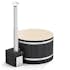 Utsidan har en monterad ytterpanel med räfflad, hållbar och underhållsfri yta av återvunnen plast i en vacker färg. Den passar väl in i en modern miljö. Ytan är enkel att rengöra, och materialet kräver ingen skötsel utöver tvätt. Ytterpanels nedre ändpanel möts en bit ovanför marken och skyddas av den svarta slitstarka bottenplattan av ABS-plast som stilrent sveper runt badtunnan vid marken.