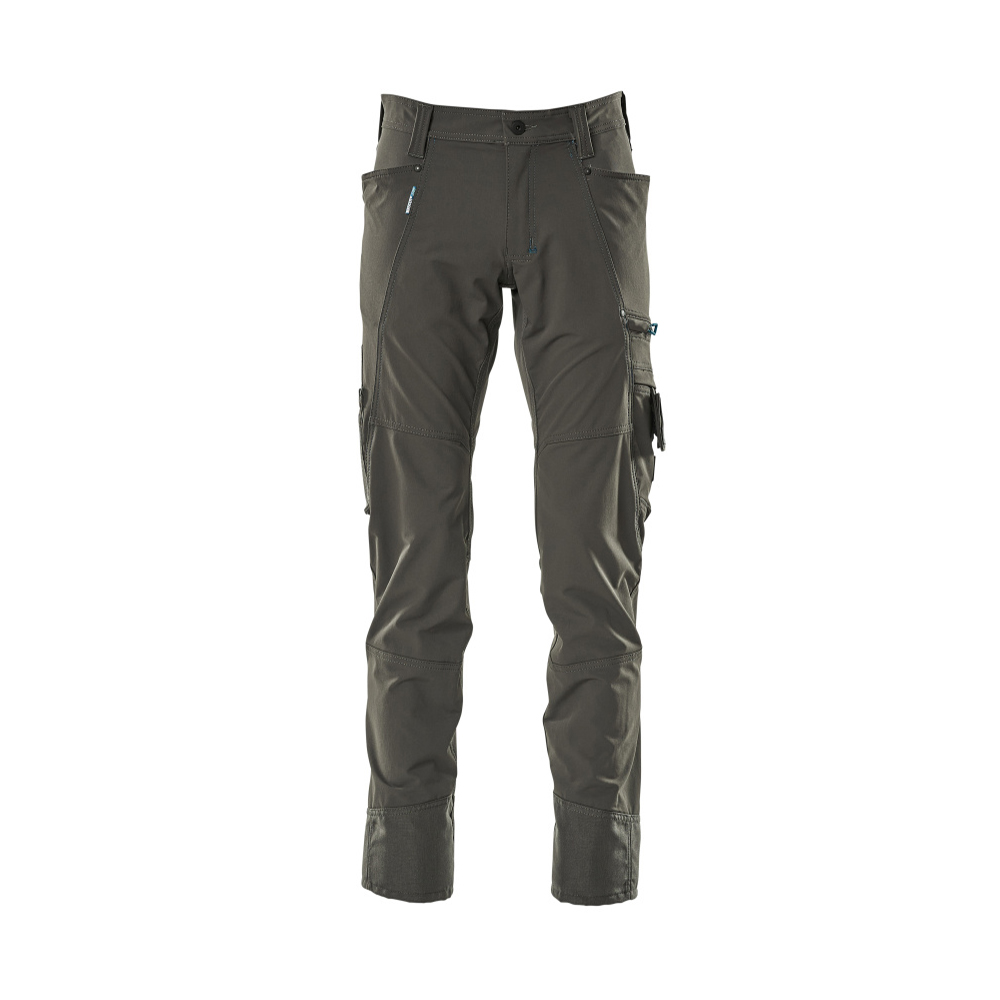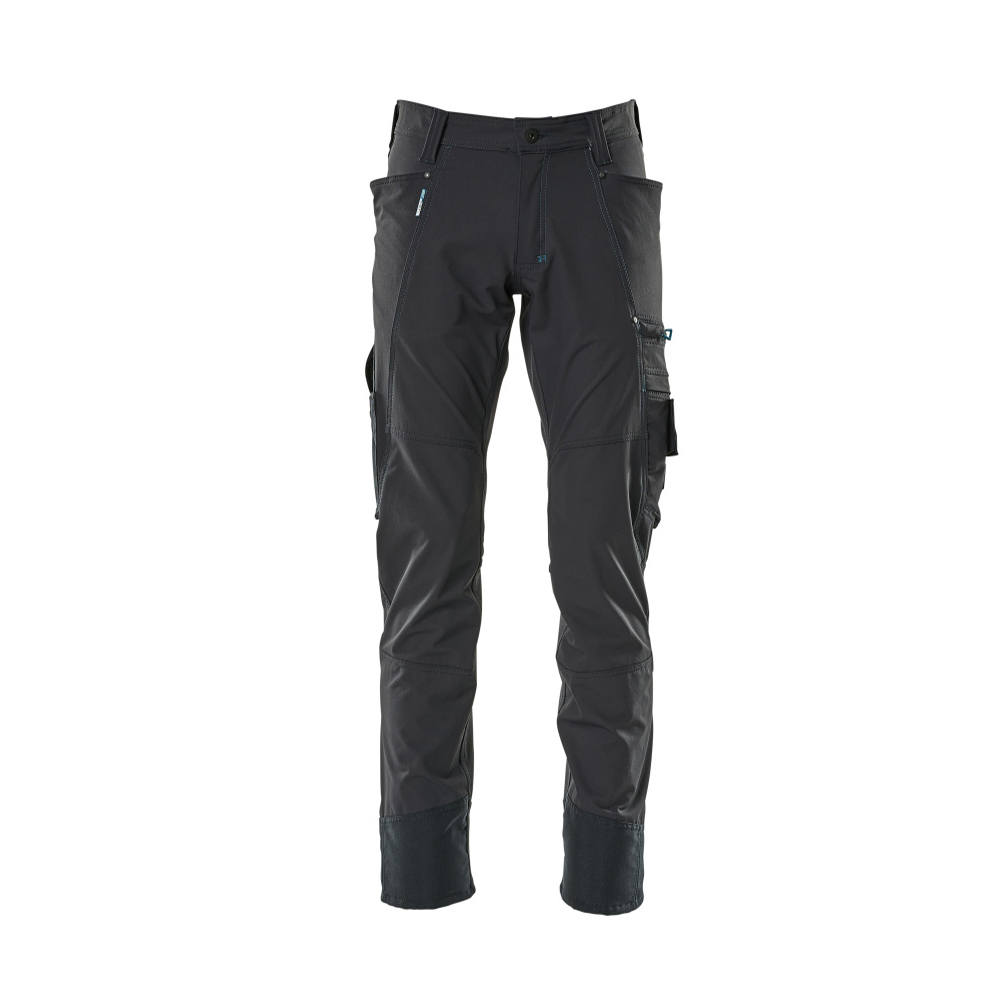 Har en vattenavvisande yta. Ultimate stretchtyg med låg vikt och hög slitstyrka. Tyget känns nästan inte av mot huden eftersom fickorna har integrerats i designen. Tvånålsstickningar på benen och i grenen. Låg midja. Byxbenen är ergonomiskt formade. Bältesstroppar. Gylf med blixtlås. Fickor på framstycket. Bakfickor. Benficka med telefonficka och inbyggd ID-kortshållare. ID-kortshållaren är avtagbar. Tumstocksficka i CORDURA® med extra fickor. Reflexeffekter.