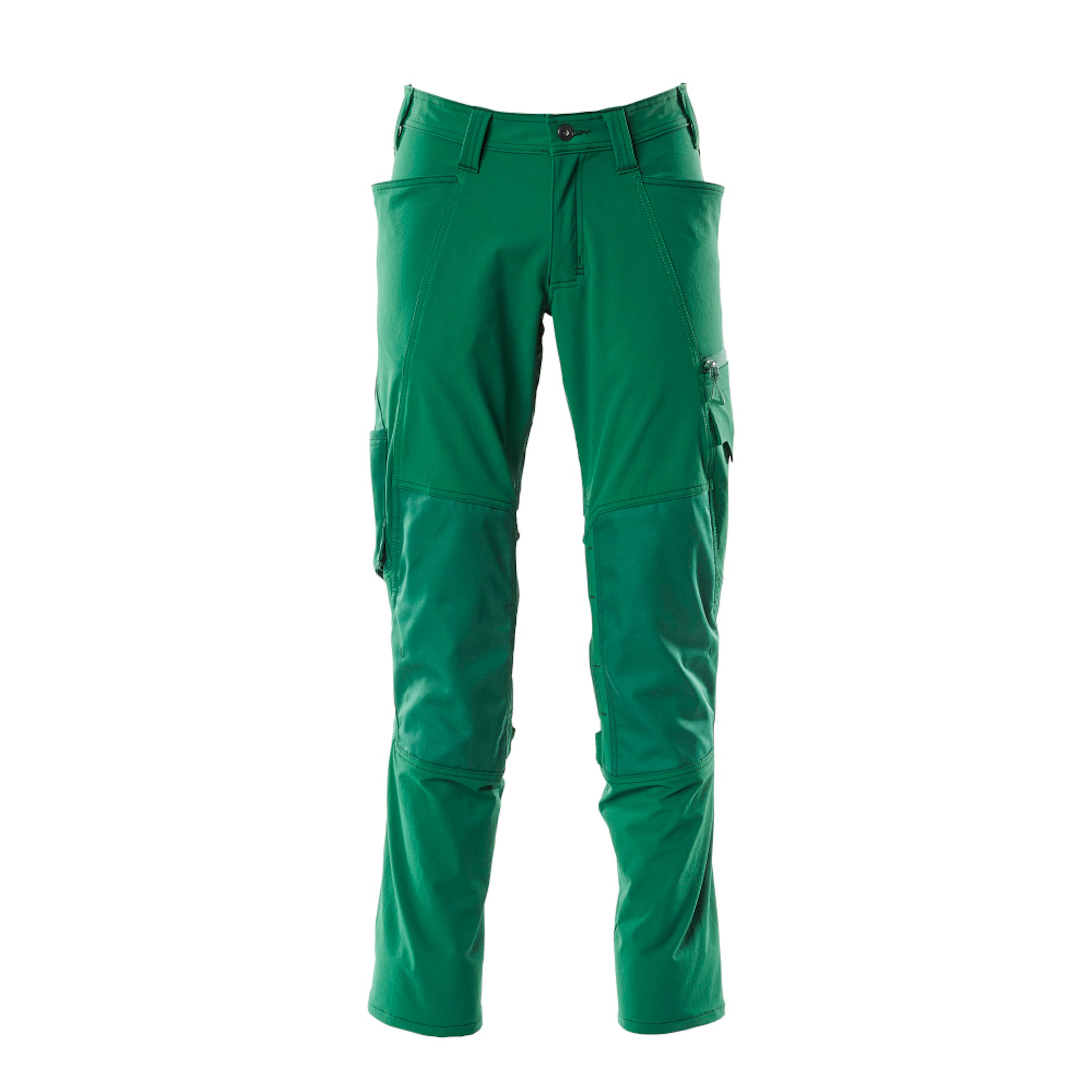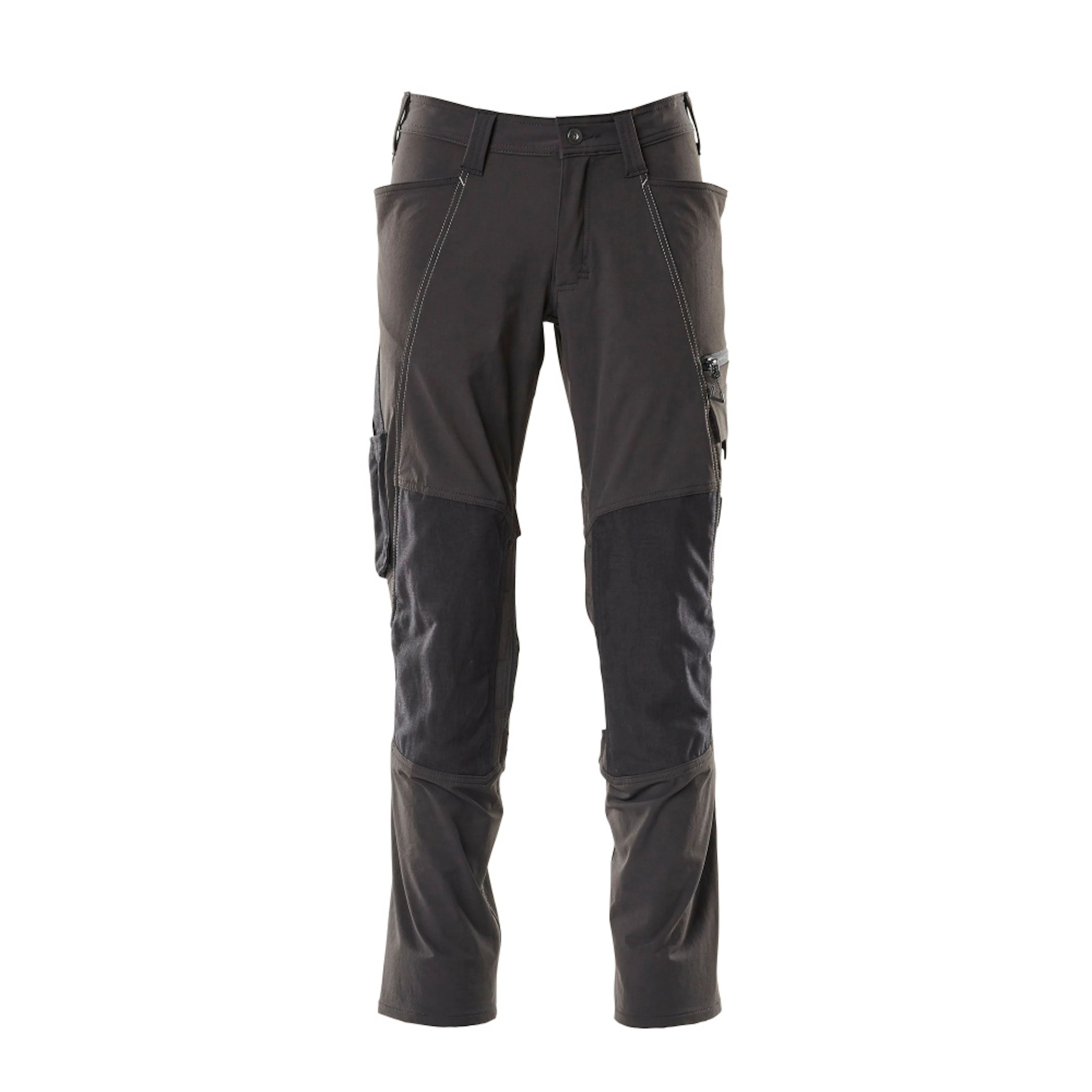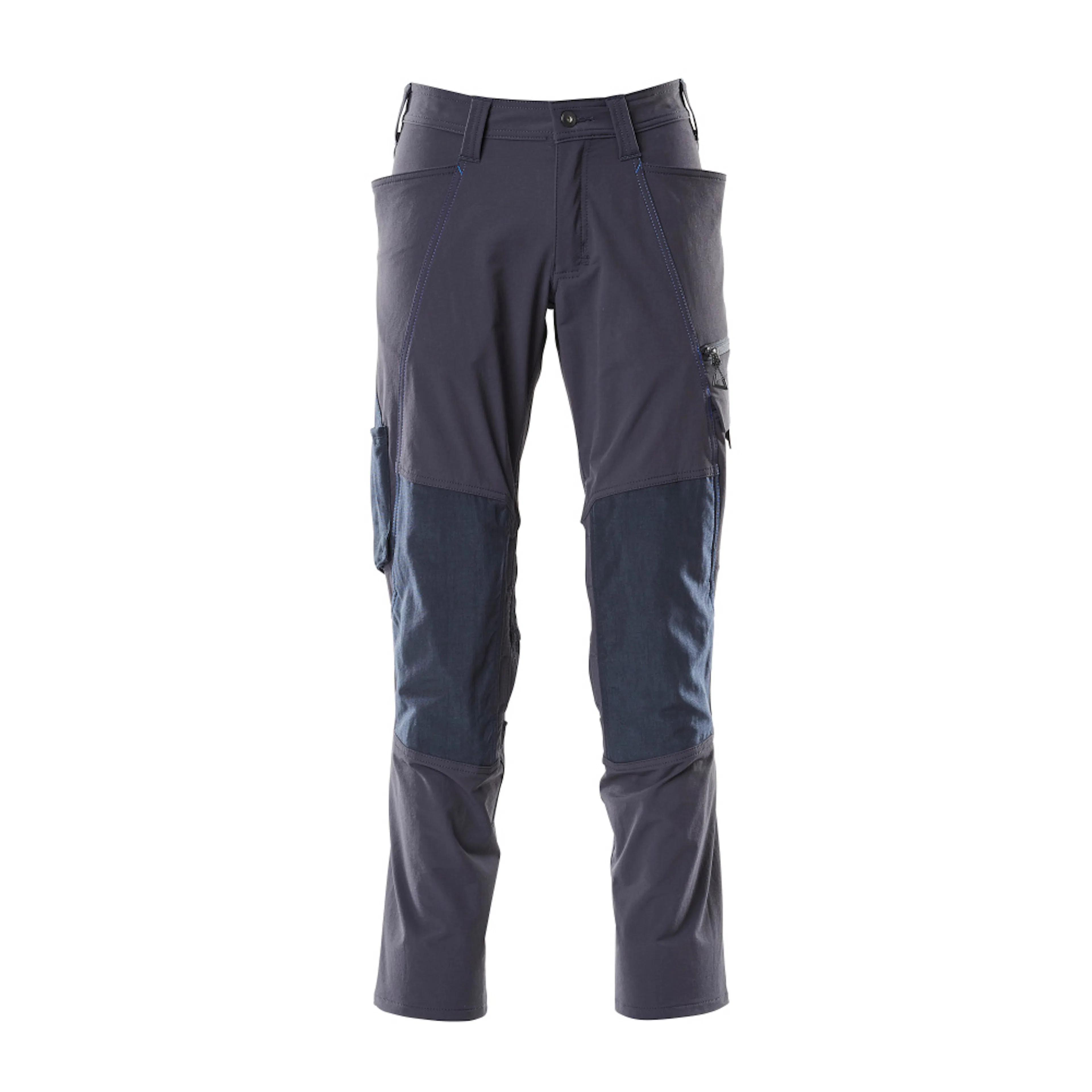 Stretchtyget är elastiskt åt alla håll, vilket ger en unik rörelsefrihet, där inget stramar eller irriterar. Det multifunktionella stretchtyget kombinerar låg vikt med mycket hög slitstyrka, samtidigt som det är vattenavvisande. Den låga skärningen med formskuren linning ser till att byxorna följer och stöder alla kroppens rörelser. Knäfickorna i slitstarkt CORDURA® är reglerbara, så att knäskydden får den optimala placeringen. Knäskydd sätts enkelt in från sidan med blixtlås, medan man har på sig byxorna. Effektiv ventilation vid knäområdet via blixtlås på sidan av benet. Som standard i tre olika benlängder så kan du välja den bästa passformen och den optimala placeringen av detaljer just för dig. Tyget tål industritvätt. Samcertifierade för användning med MASCOT:s knäskyddstyp SHORT eller LONG, eftersom knäskyddsfickan kan höjdjusteras.