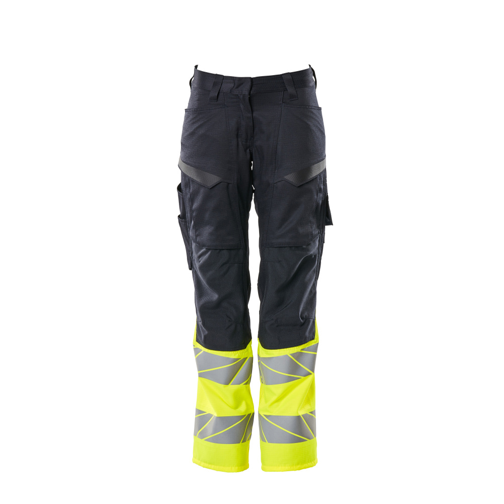 Lady passform DIAMOND. Fluorescerande kontrastfärg och med reflexer. Tvåfärgat. Delar av produkten är av stretchtyg. Kombination av lättviktigt tyg kvalitet 236 och ULTIMATE STRETCH kvalitet 511. Tvånålsstickningar på benen och i grenen. Låg midja. Knäppningen är dold. Stängning med blixtlås. Byxbenen är ergonomiskt formade. Bältesstroppar. D-ring. Fickor på framstycket. Bakfickor med förstärkningar. Hammarstroppen är justerbar. Tumstocksfickan är förstärkt. Fickor med lock på framsidan av låret. Justerbara knäfickor i slitstark CORDURA® (500 D). Enkel individuell justering av knäficka höjd. Benficka med telefonficka och lock med dolda tryckknappar. Med tryckeffekter. Förberedd för hängfickor 19450-126 som sätts fast med knappar. Innerbenslängden kan ökas med 3 cm genom att ta bort den invändiga röda sömmen vid foten. Vi rekommenderar 00718-100, 00418-100, 50454-916 & 20118-915 knäskydd till den här modellen. Samcertifierade med knäskyddstyp SHORT eller LONG enligt EN 14404.
