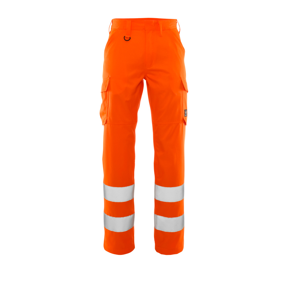 Fluorescerande och med reflexer. Har en vattenavvisande yta. Trenålsstickningar på benen och i grenen. Byxbenen är ergonomiskt formade. Gylf med blixtlås. D-ring. Fickor på framstycket. Bakfickor med lock. Benfickor med lock och dolda tryckknappar. Innerbenslängden kan ökas med 3 cm genom att ta bort den invändiga röda sömmen vid foten.