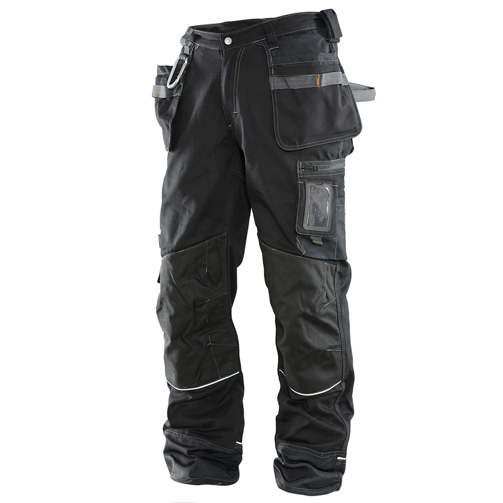 2181 Hantverksbyxa Core. Ringspunnen bomull/polyester är en kvalitet med styrka från polyester och komfort från bomull, vilket ger hög slitstyrka och hög komfort. Insydda framfickor. Förstärkta hölsterfickor med extrafack och ripsband för verktyg. Telefonficka på höften och karbinhake fram. Extra breda hällor för livrem. Förstärkta bakfickor. Tumstocksficka med knivknapp. Vänster benficka har blixtlås, ID-kortsfack samt telefonfack och verktygsfack. Förböjda knän med slitstarka knäfickor i DuPont™ Kevlar®. Knäskydden kan justeras i två höjder. Förstärkt benslut i polyamid som inte absorberar fukt. Reflexpasspoal och dragsko i benslutet. Certifierad enligt EN 14404:2004+A1:2010 Typ 2 Nivå 1 tillsammans med Jobmans knäskydd 9943, 9944 och 9945.