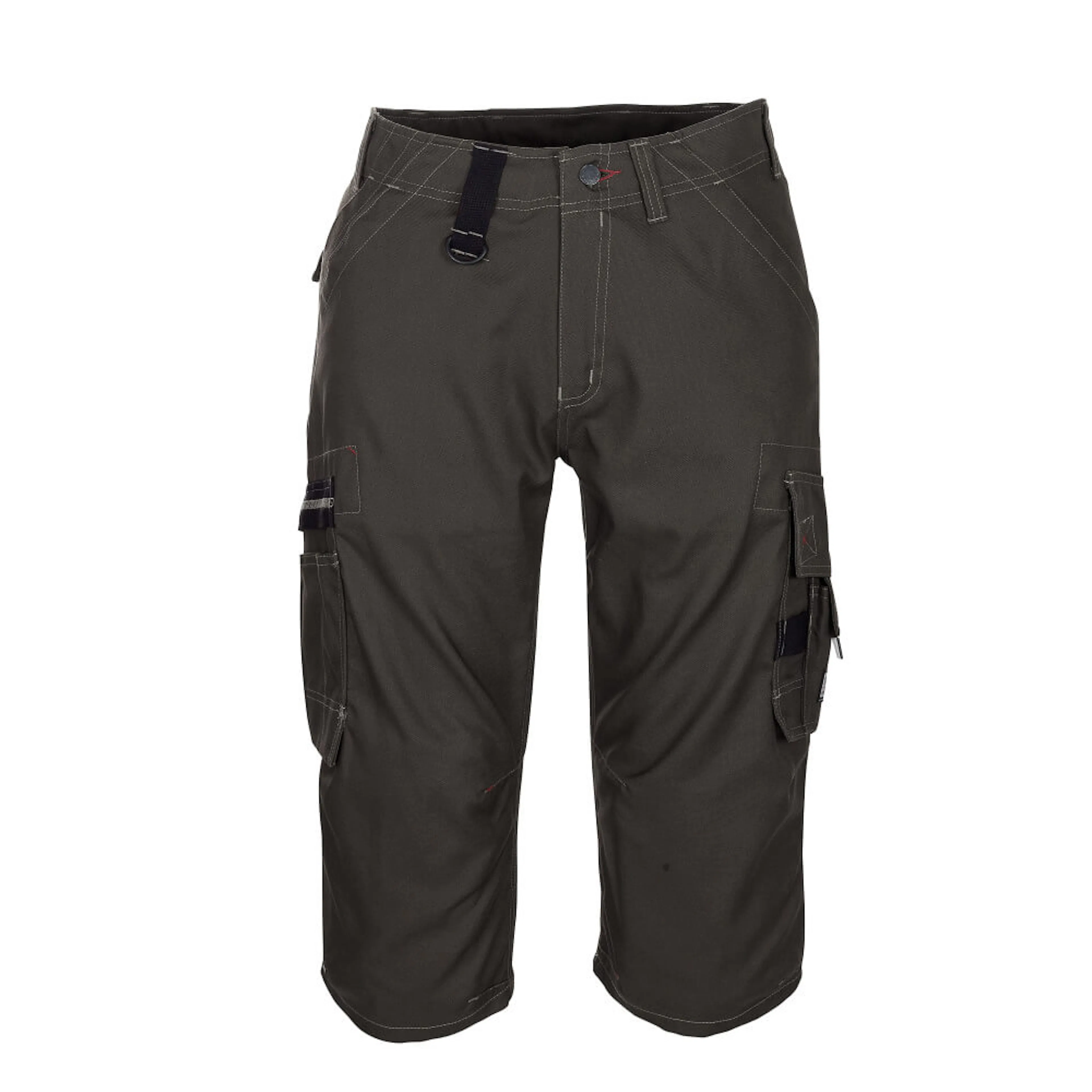 Tvånålsstickningar och trenålsstickningar på benen och i grenen. Låg midja och formskuren linning. Byxbenen är ergonomiskt formade. Bältesstroppar. Gylf med blixtlås. Fickor på framstycket. D-ring. Bakfickor, en med lock och kardborreband och en med dolt blixtlås. Benfickor, en med lock och kardborreband och en med dolt blixtlås. Telefonbenficka med lock, och justerbart kardborreband. Pennfickor. Kontraster (röda) diskret fördelade på delar av plagget. Reflexeffekter.