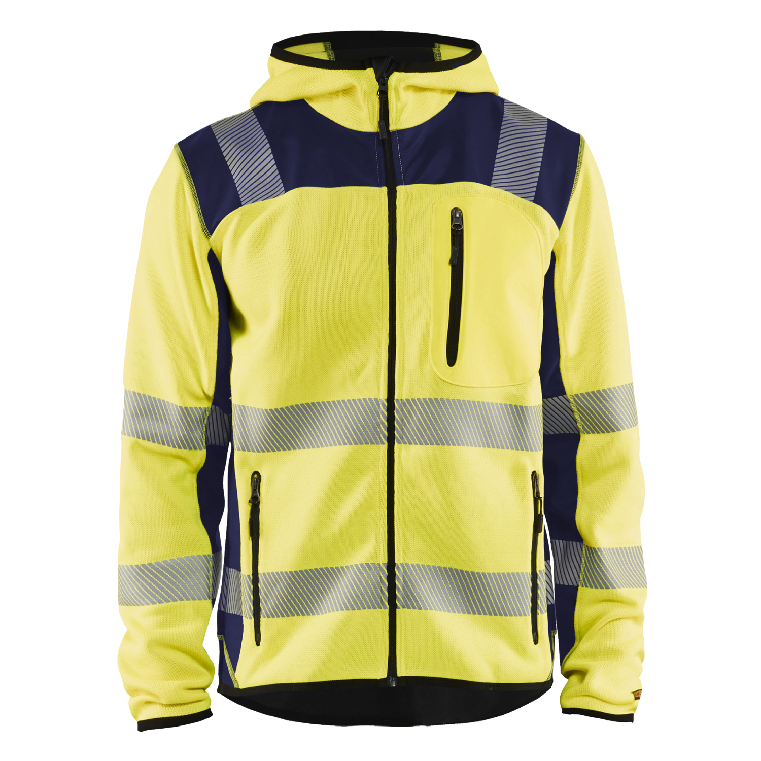 Stickad jacka från Blåkläder i varsel med huva i snygg design och bekväm kvalitet. Jackan har skurna reflexer för bra andningsförmåga och elasticitet. Försedd med dragkedjor och förstärkt med softshellmaterial på axlar, ärmar och i ryggslut för ökad slitstyrka. Funkar för både fritid och arbete.