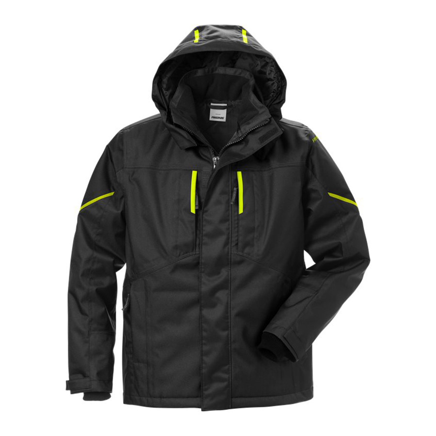 Vatten- och vindtät vinterjacka från Fristads som har bra andasegenskaper. Försedd med quiltat foder, kraftiga förstärkningar och har en avtagbar huva.