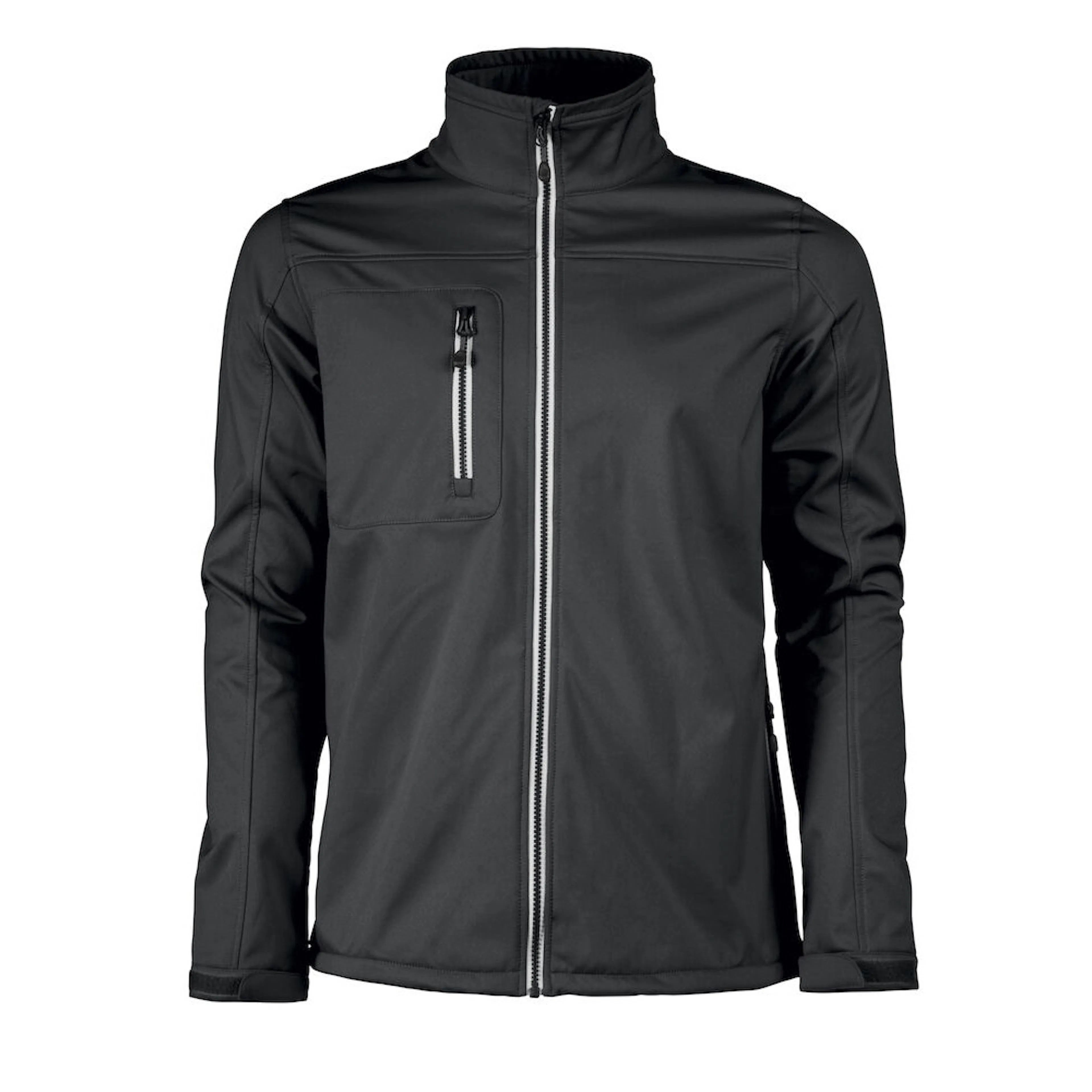 Softshelljacka med 3-lagersmaterial (WP 1000/MVP300) med funktionellt membran och värmande fleece på insidan, YKK-dragkedjor framtill, i framfickor och bröstfickan, Elastisk dragsko i huvan och justerbara ärmavslut,