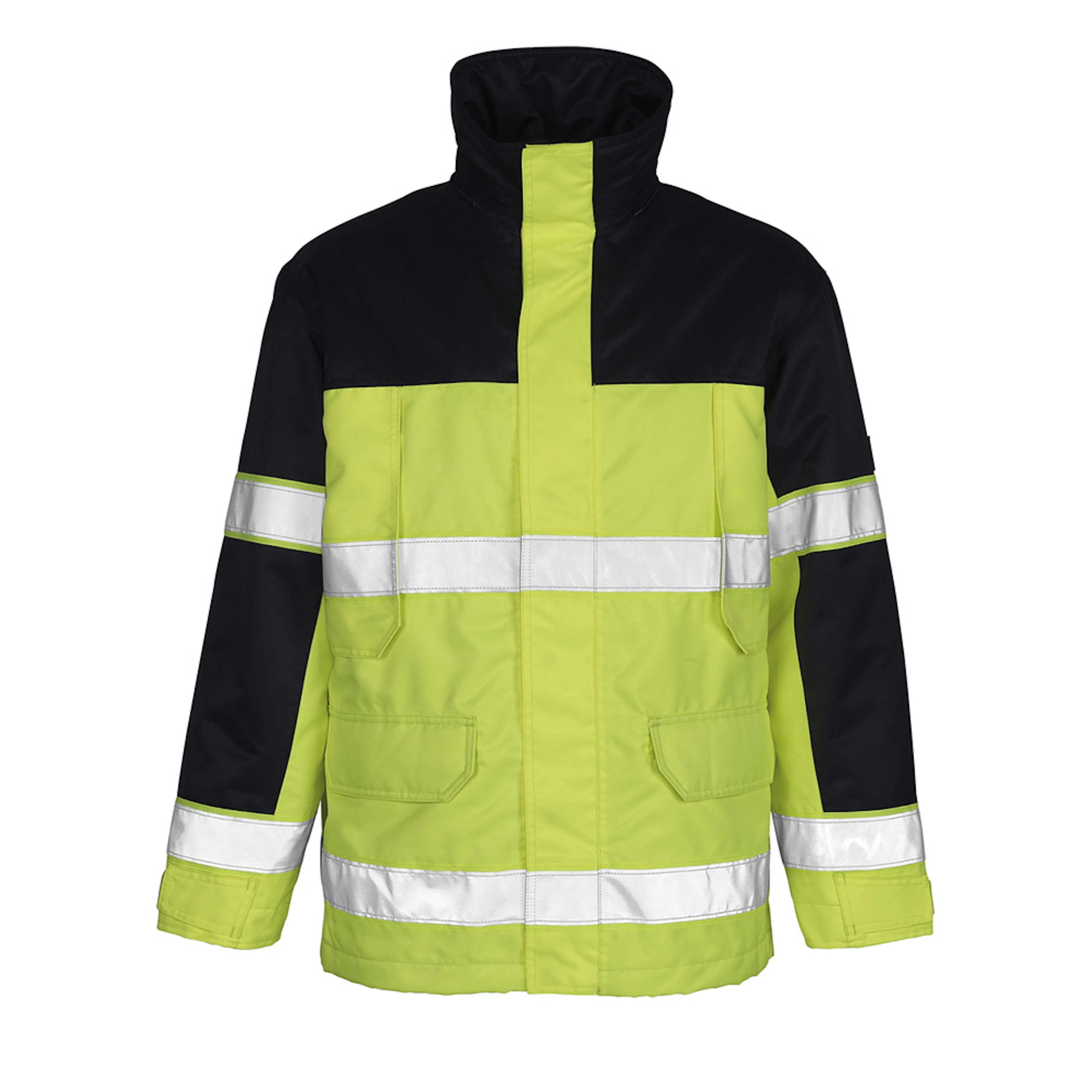 Fluorescerande och med reflexer. Tvåfärgat. Andas, vind- och vattentät. Sömmarna är tejpade. Quiltfoder kan tas bort med blixtlås. Stängning med tvåvägsblixtlås, dubbelt vindskydd och dolda tryckknappar. Blixtlåsficka under vindskydd. Bröstfickor med blixtlås. D-ring. Framfickor med lock och dolda tryckknappar. Ribbstickning vid handleden (dold i vindskyddet). Resårkanten i nederkanten är reglerbar.