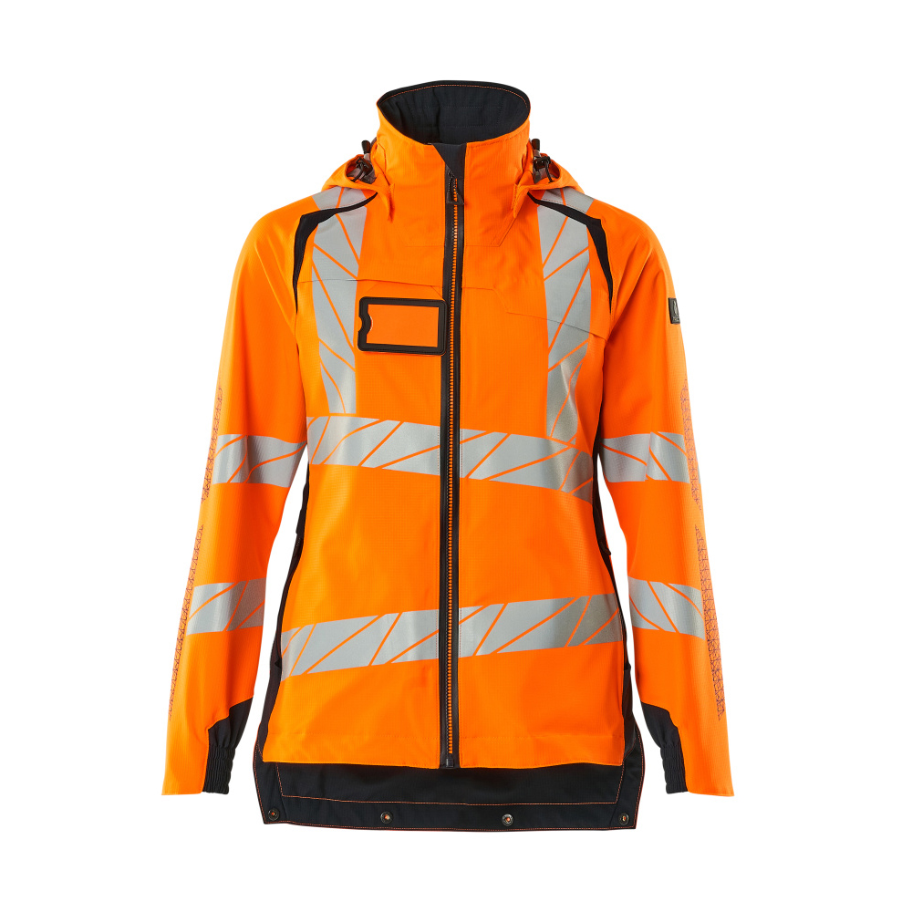 Lady passform. Fluorescerande med lodräta och sneda tvärgående reflexer. Tvåfärgat. Hög andningsbarhet samt vind- och vattentät. Sömmarna är tejpade. Huvan är avtagbar, fodret har justerbart resårsnöre. Reglerbar metalltråd i båda sidorna av huvan. Stängning med vattentätt blixtlås och invändigt vindfång. Innerfickor - två med blixtlås och en öppen nätficka. ID-kortshållaren är avtagbar. Bröstficka med vattentätt blixtlås. Framfickor med vattentäta blixtlås. Hög krage. Ribbstickning i nedre kanten på framsidan av jackan. Extra tyg nederst på ryggen kan vikas ned med knappar och ge extra längd baktill och därmed extra skydd mot väder och vind. Ribbstickning vid handleden (dold i vindskyddet). Resår vid handleden. Med tryckeffekter.