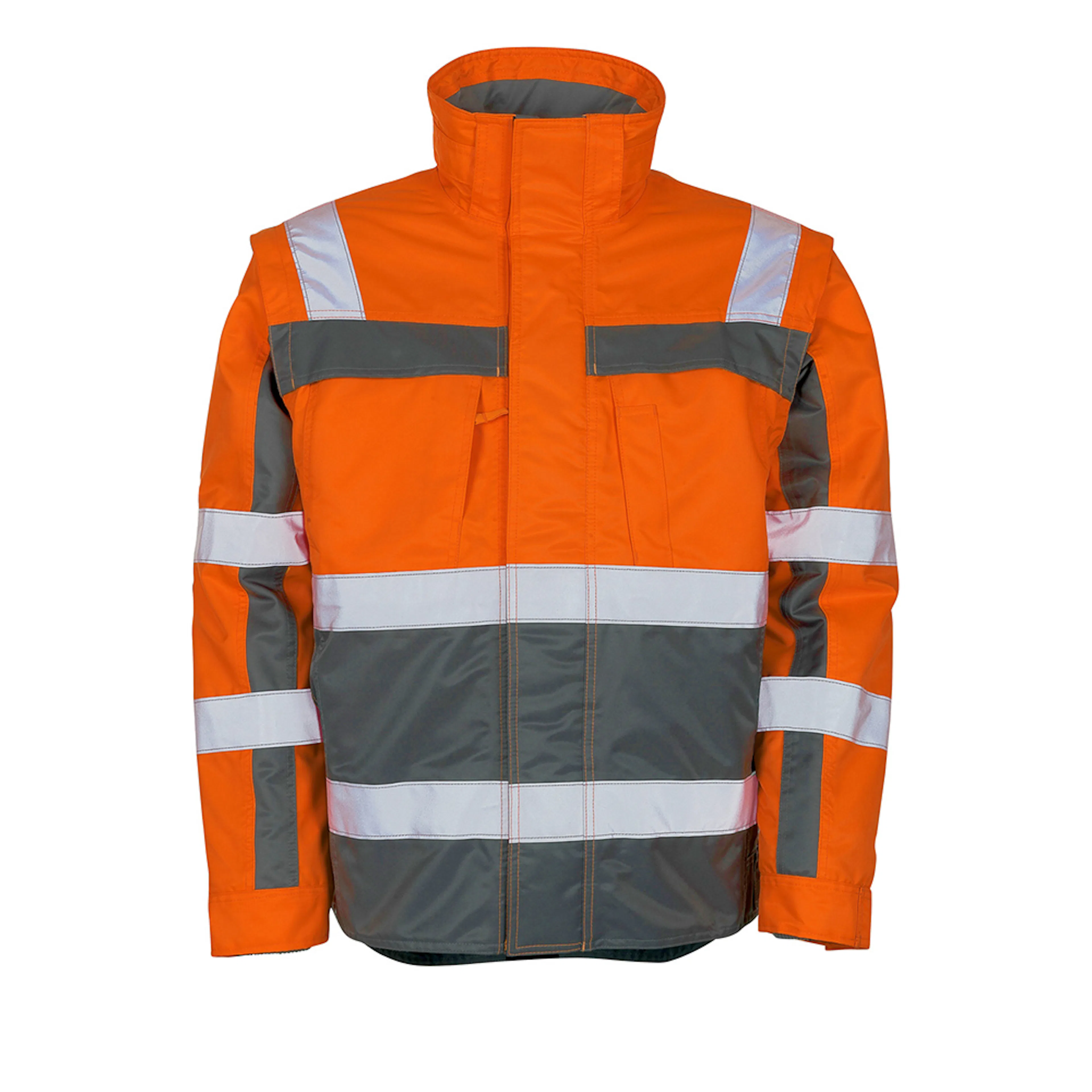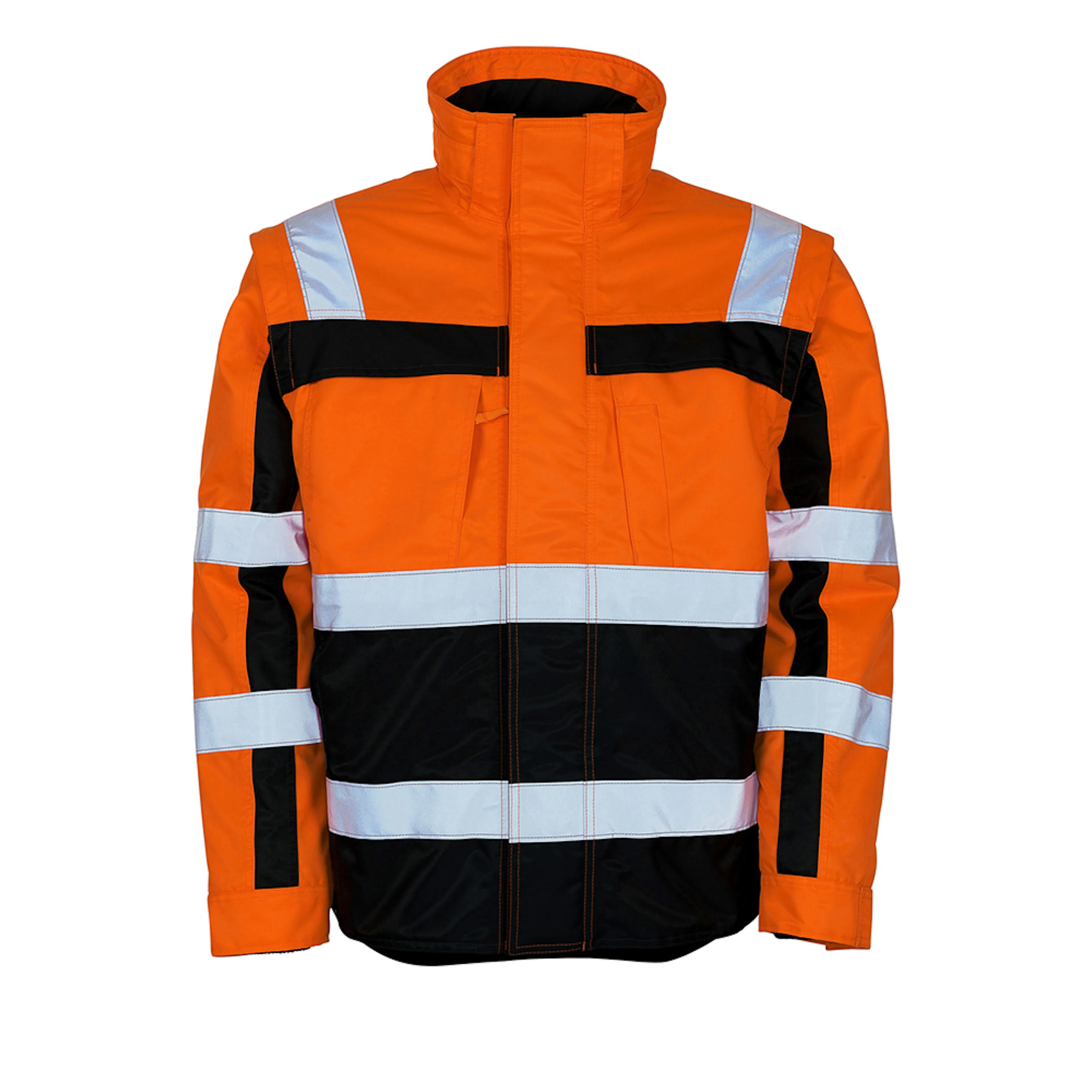 Andningsbar, vindtät och vattenavvisande. Möjlighet att sätta på huvan med tryckknappar. Multifunktionell produkt, som kan ändras efter situationen – rymmer både skaljacka, skalväst, termojacka och termoväst. Kviltfodret är en jacka i sig, godkänt enligt EN ISO 20471, med ribbstickad krage och avtagbara ärmar. Extra skydd mot kyla genom förlängd rygg.