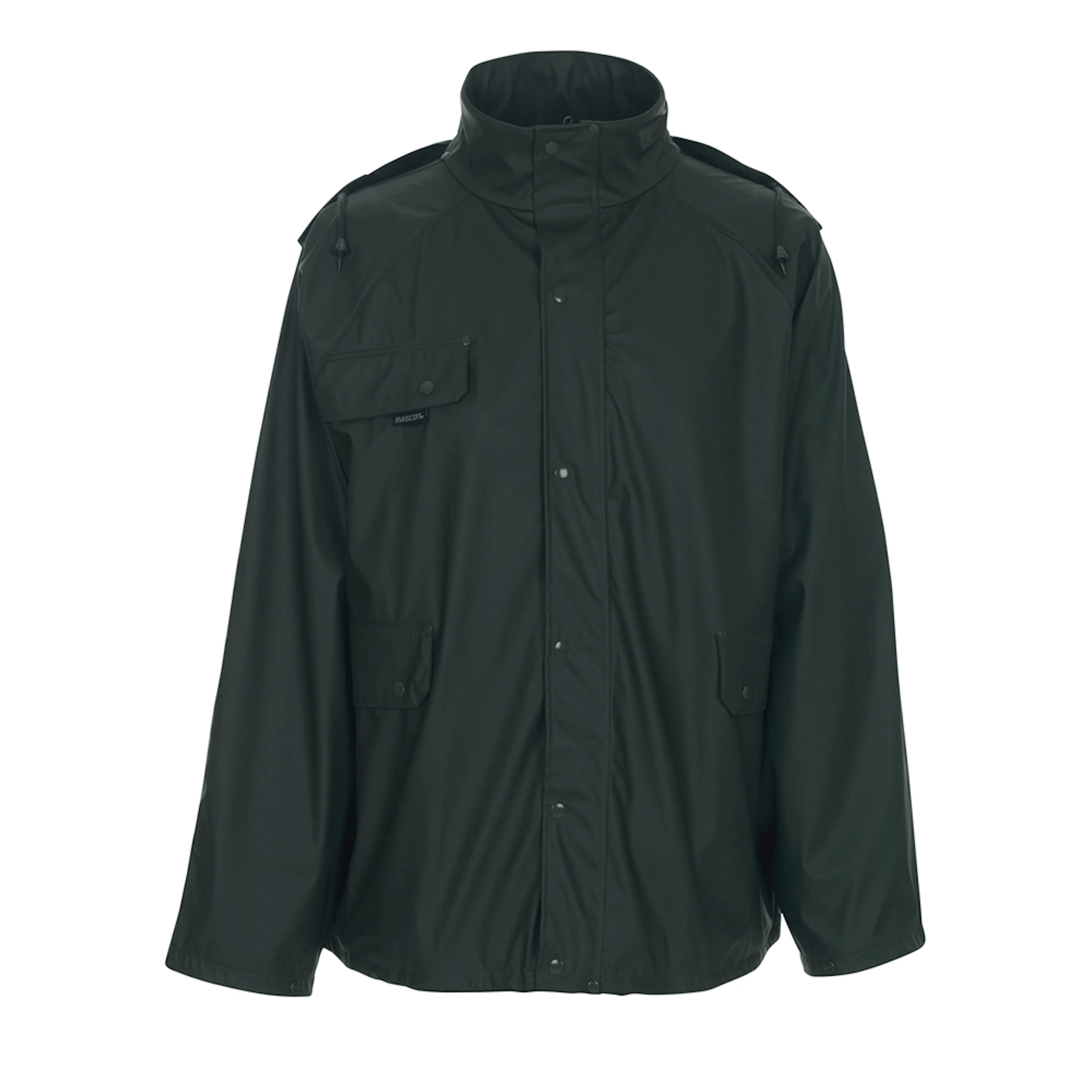 Vind- och vattentät. Sömmarna är svetsade. Huva dold i kragen. Stängning med blixtlås och vindskydd med tryckknappar. Bröstficka med lock och tryckknapp. Framfickor med lock och tryckknappar. Ventilation i ryggen. Resårkanten i nederkanten är reglerbar. Tryckknappsjustering vid handleden.
