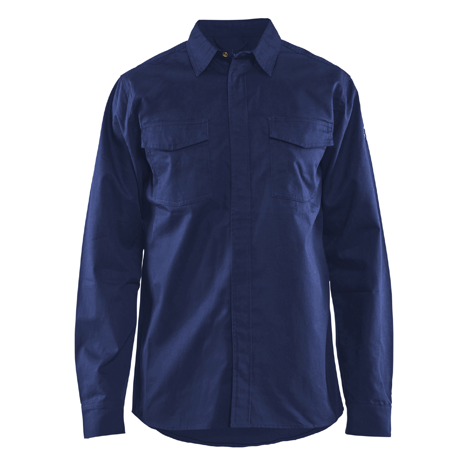 Flamskyddad skjorta från Blåkläder i smart och funktionell design med dolda knappar framtill och quick release-funktion. Materialet är komfortabelt med behaglig passform och god rörlighet.