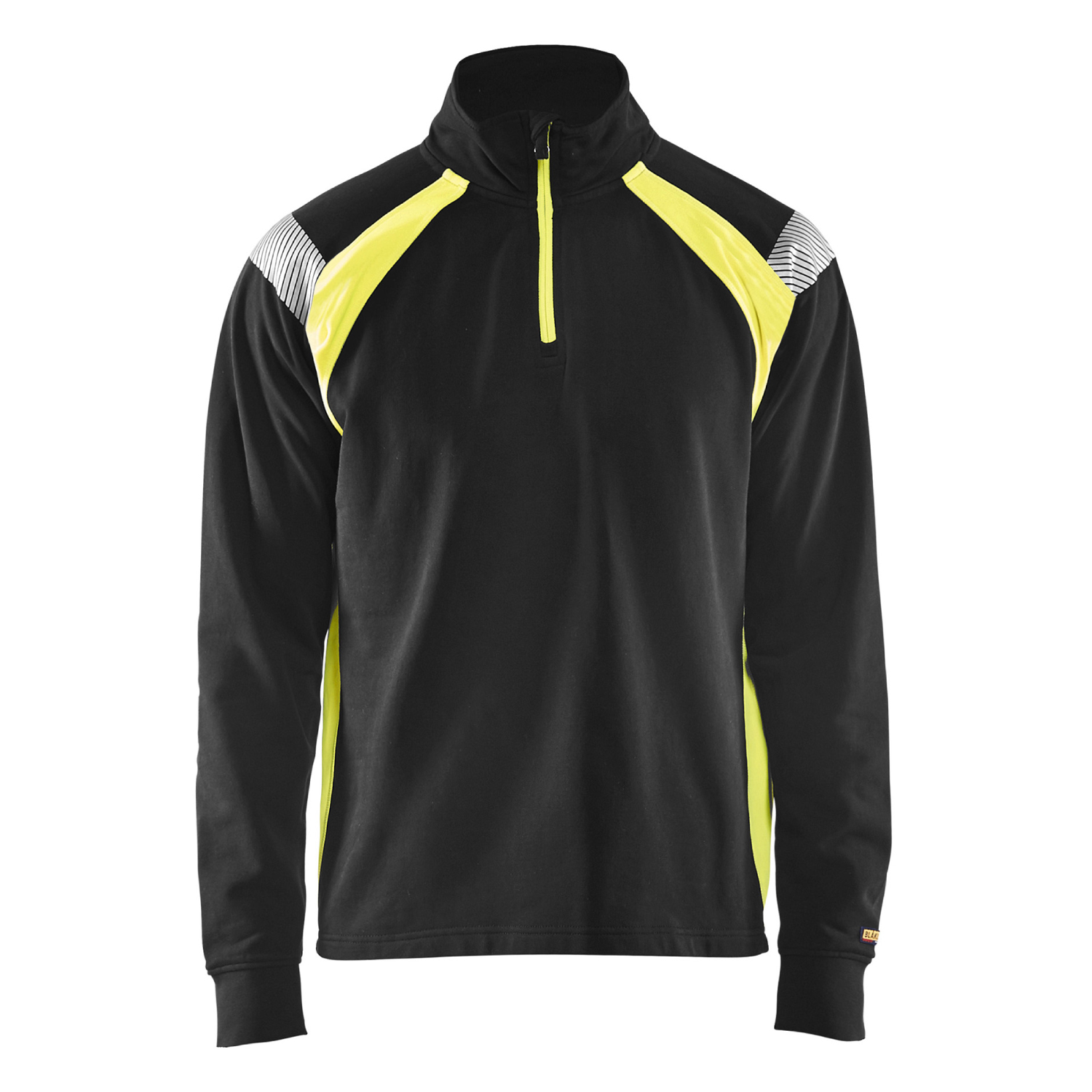 Tröja från Blåkläder med skurna reflexdetaljer och paneler i varsel för ökad synbarhet. Tröjans mörka parti består av 100% bomull och varselpartiet i 100% polyester. Tröjan har mudd i ärmen och förlängt ryggslut.