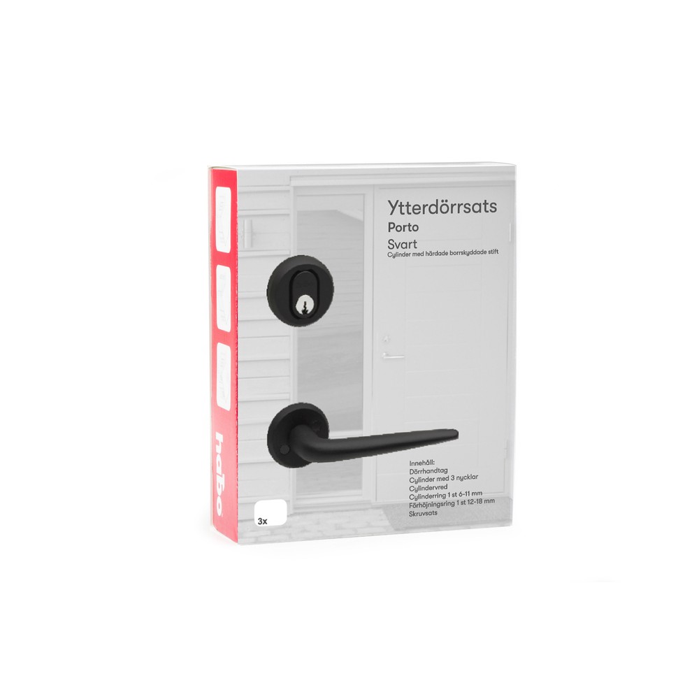 Beslagspaket Habo Porto är en komplett ytterdörrsats av aluminium, med dörrhandtag Porto. Det har dubbelverkande returfjäder och är perfekt för bodar, fritidshus, garage etc. Paketet levereras med cylinder inklusive 3 st nycklar, cylindervred, cylinderring Universal och skruvar. Passar dörrtjocklek 30-80 mm.