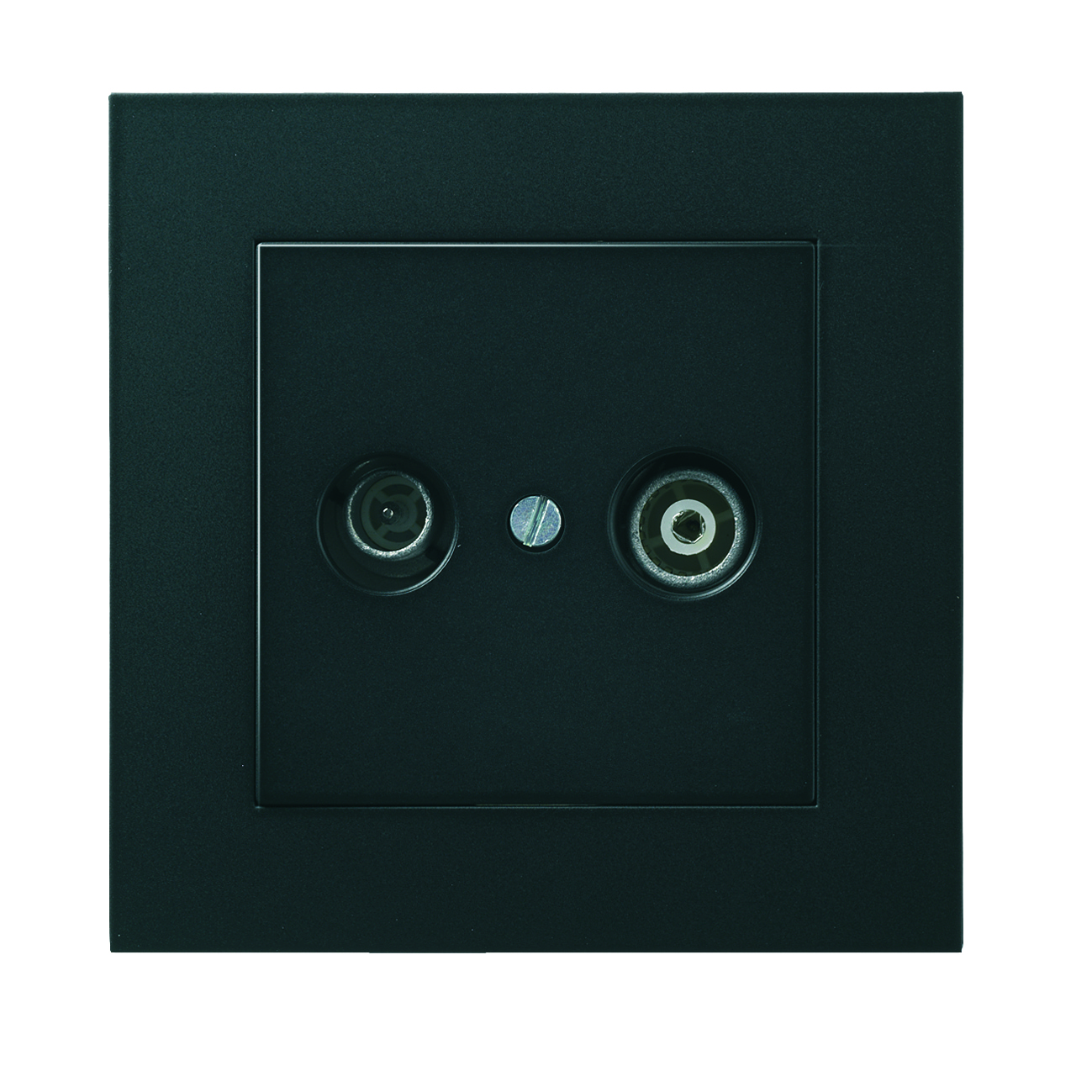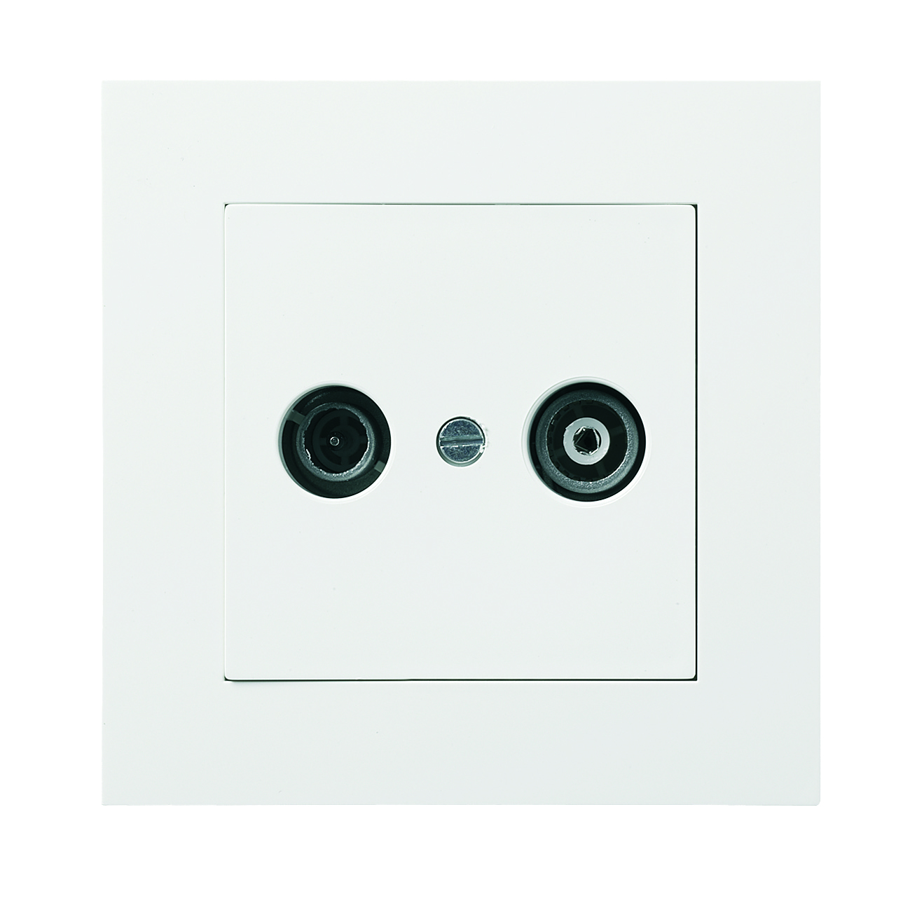 Antennuttag Plus, infälld. Komplett Radio/TV-uttag inklusive kontaktdon. Antennuttaget är ett serieuttag på 7dB och varje serie/kaskad ska avslutas med ett ändmotstånd. Centrumplatta och ram av halogenfri termoplast. Passar i apparatdosa med fästskruvavstånd 60.