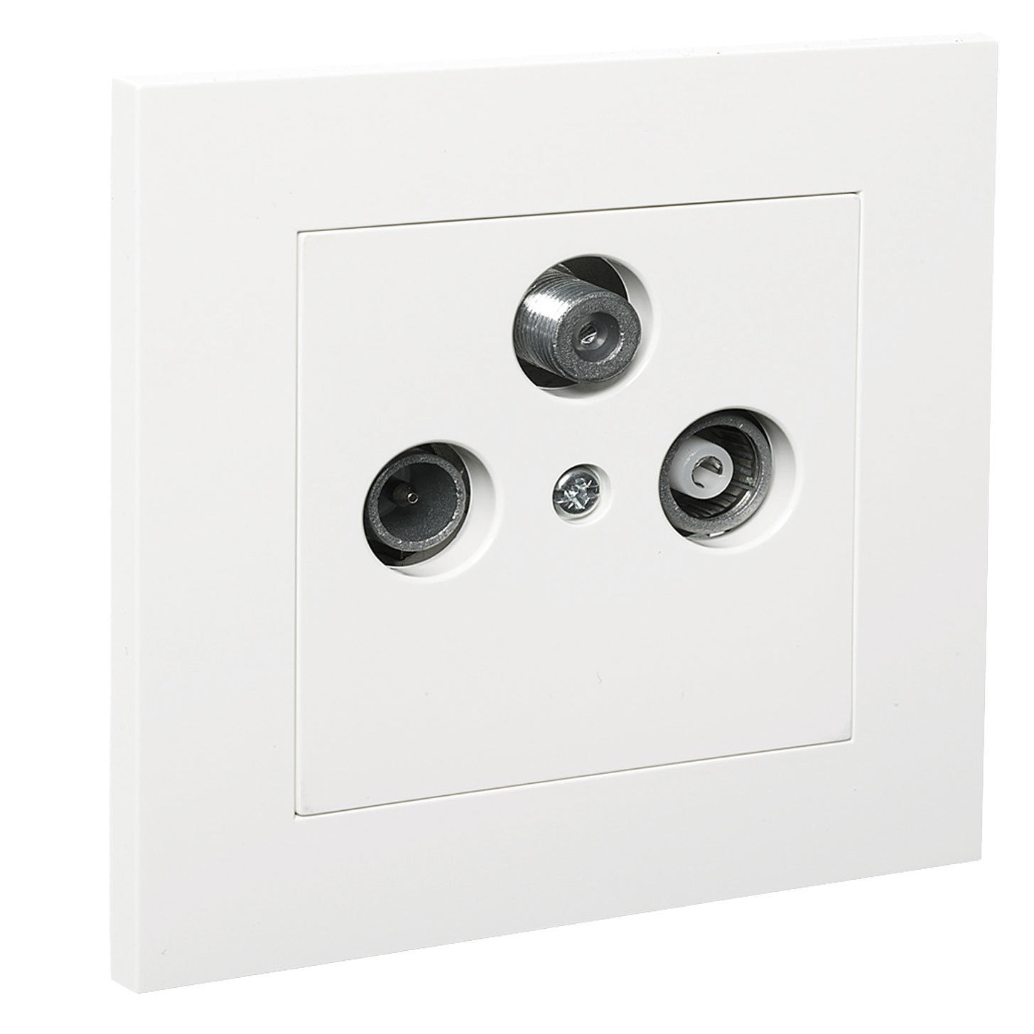 Antennuttag Plus, infälld. Komplett Radio/TV/Satellituttag inklusive kontaktdon. Satellituttaget är ett slututtag på 3dB och går inte att seriekoppla. Satellitutgången har en F-kontakt (hona). Centrumplatta och ram av halogenfri termoplast. Passar i apparatdosa med fästskruvavstånd 60.