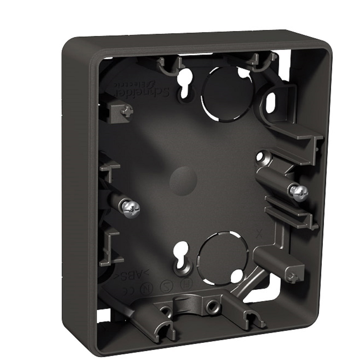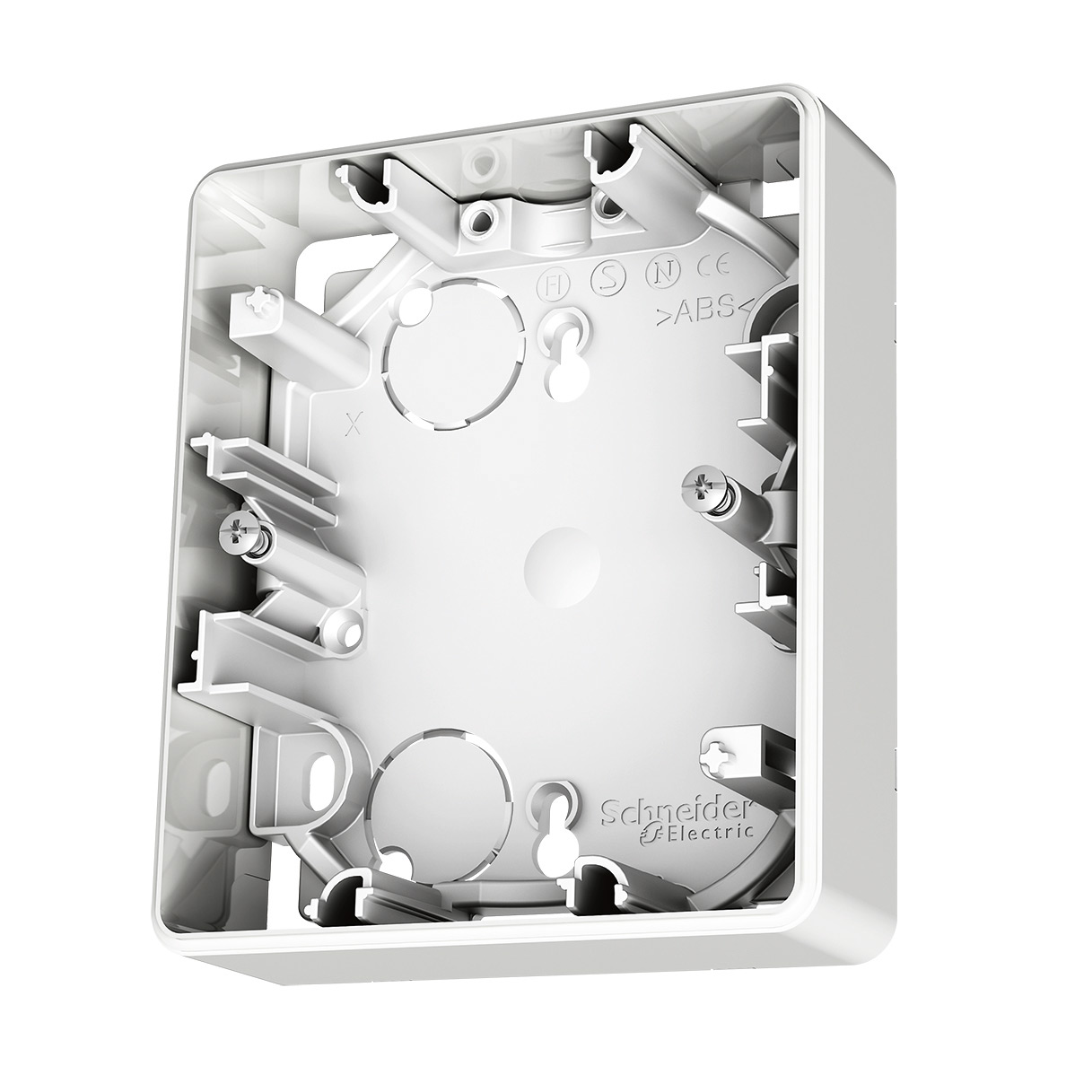 Exxact Dosa för 2-vägsuttag från Schneider Electrics för utv mont, nyckelhål för montage över apparatdosa. Utbrytningar i bottendel, möjligheter till att montera dragavlastning och skiljevägg. Separat bottendel och förhöjningsram förenklar installationen.