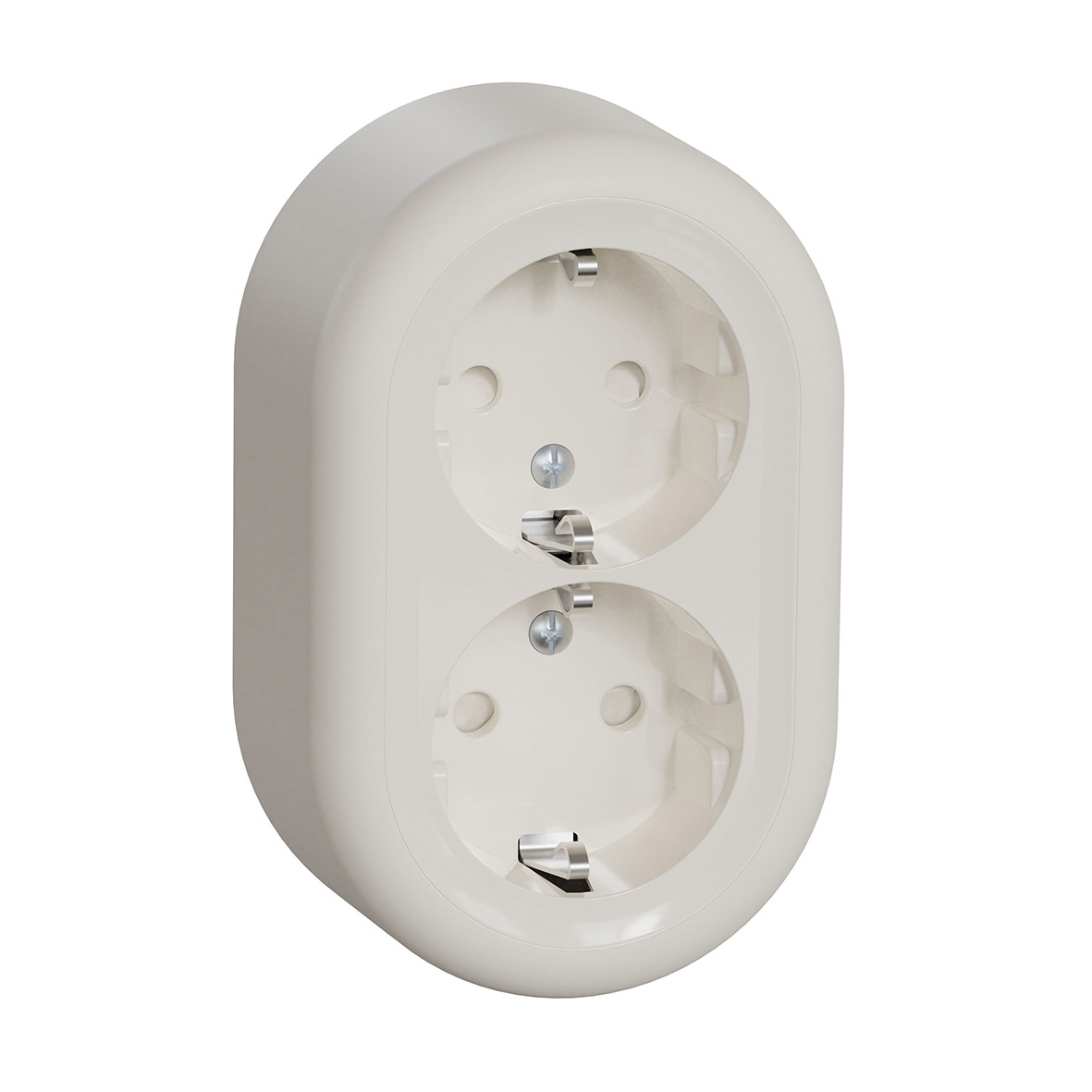 Vägguttag 2-vägs från Schneider Electrics för utanpåliggande installation med integrerad bottenplatta. 16AX, 250V, jordat, med 2st neutrala överkopplingsklämmor, petskyddat. Snabbanslutning. Ingångar för kablar från baksidan genom utbrytningar i bottenplattan eller från alla sidor med hjälp av utklipp i locket. Produkten är IP20 (även med kåpan borttagen). IP21 då kabeln förs in underifrån.