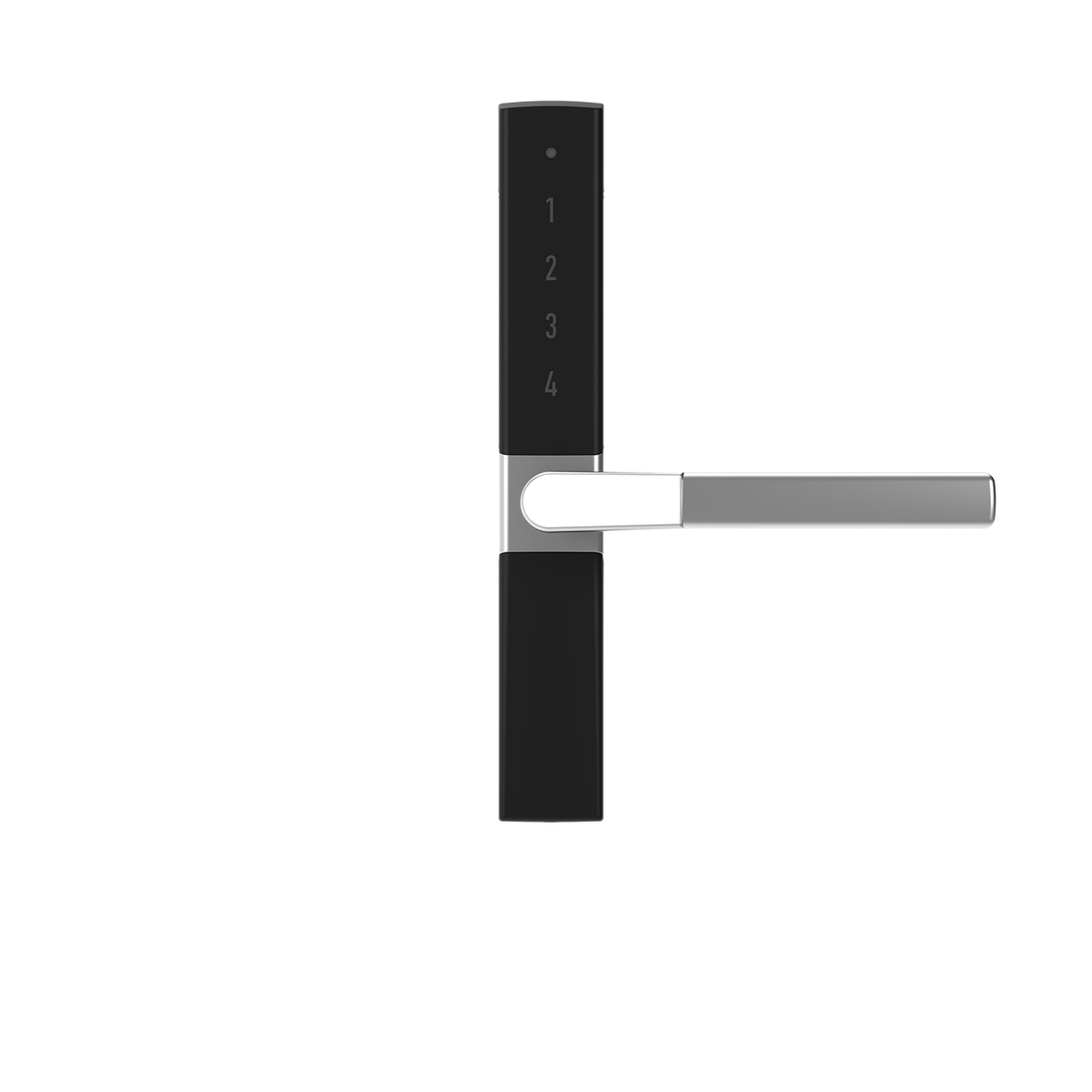 Handtaget drivs av 2 st AAA batterier (Ingår EJ). Lås och lås upp från, genom appen. Även från utsidan. Låsning kan även göras via svajpning av touchpanelen och upplåsning sker med sexsiffrig kod. Omprogrammering görs enkelt via bakgrundsupplysta touchpanelen.