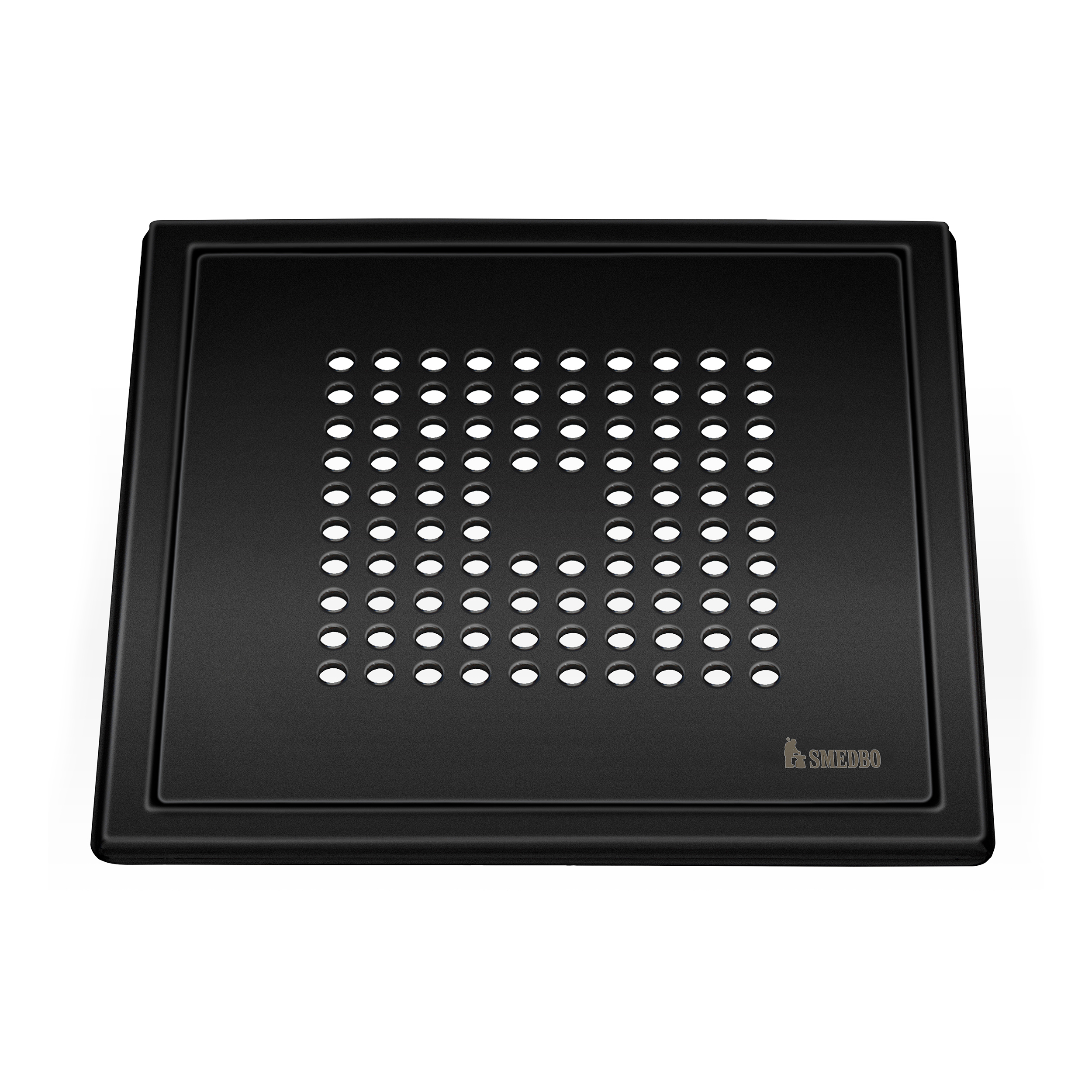 En snygg golvbrunnssil i badrumsserien Outline. Golvbrunnssilen har en kärna i rostfritt stål som passar perfekt i det fuktiga badrummet. Den har ett svart pulverlackat tåligt ytskikt och ett snyggt mönster med utstansade kvadrater.