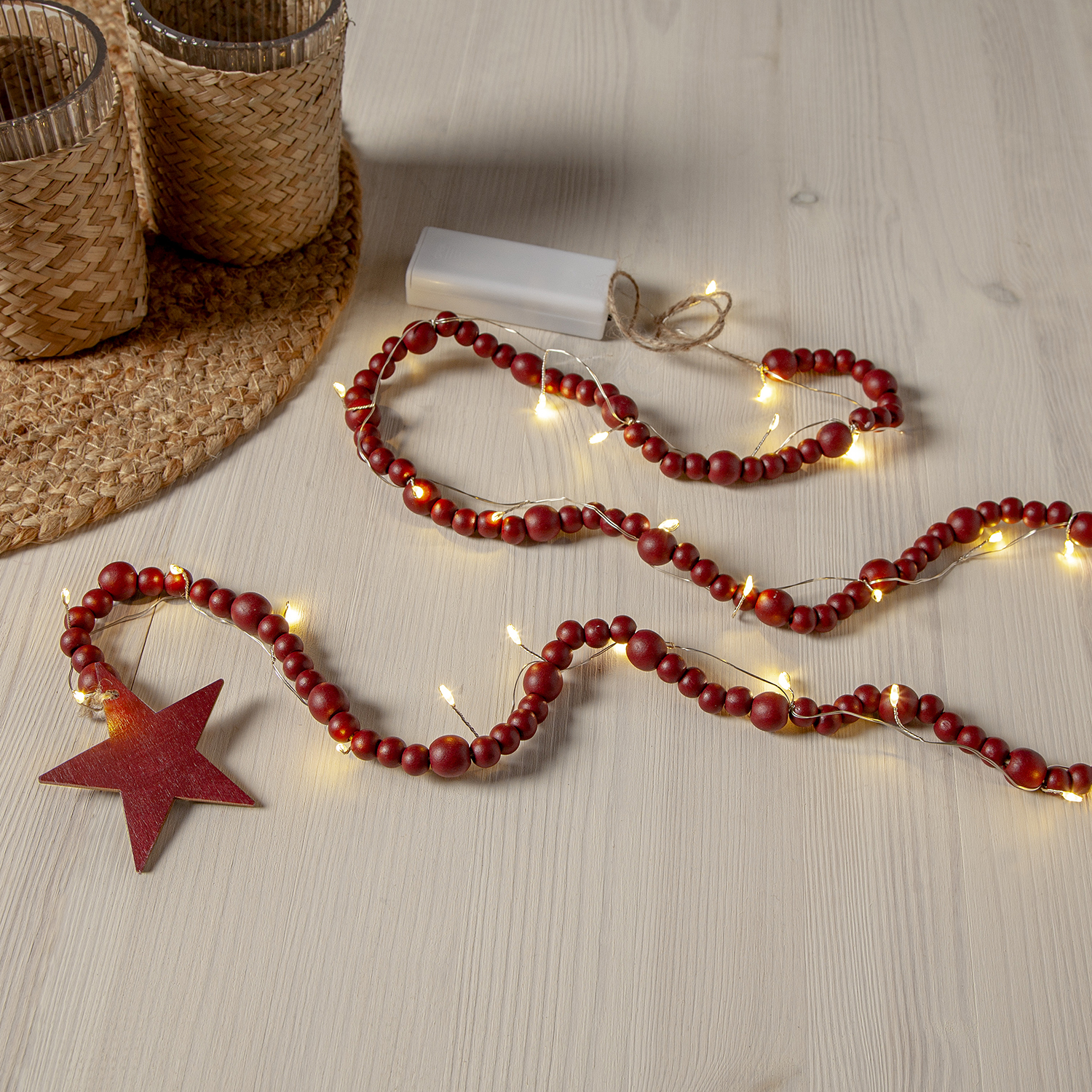 Exklusiv ljusslinga för inomhusbruk med träpärlor. Tunn metallslinga med 30 varmvita LED virad runt pärlorna ger ett vackert sken, passar till bordsdekoration och julgransdekoration. Batteribox med timerfunktion.