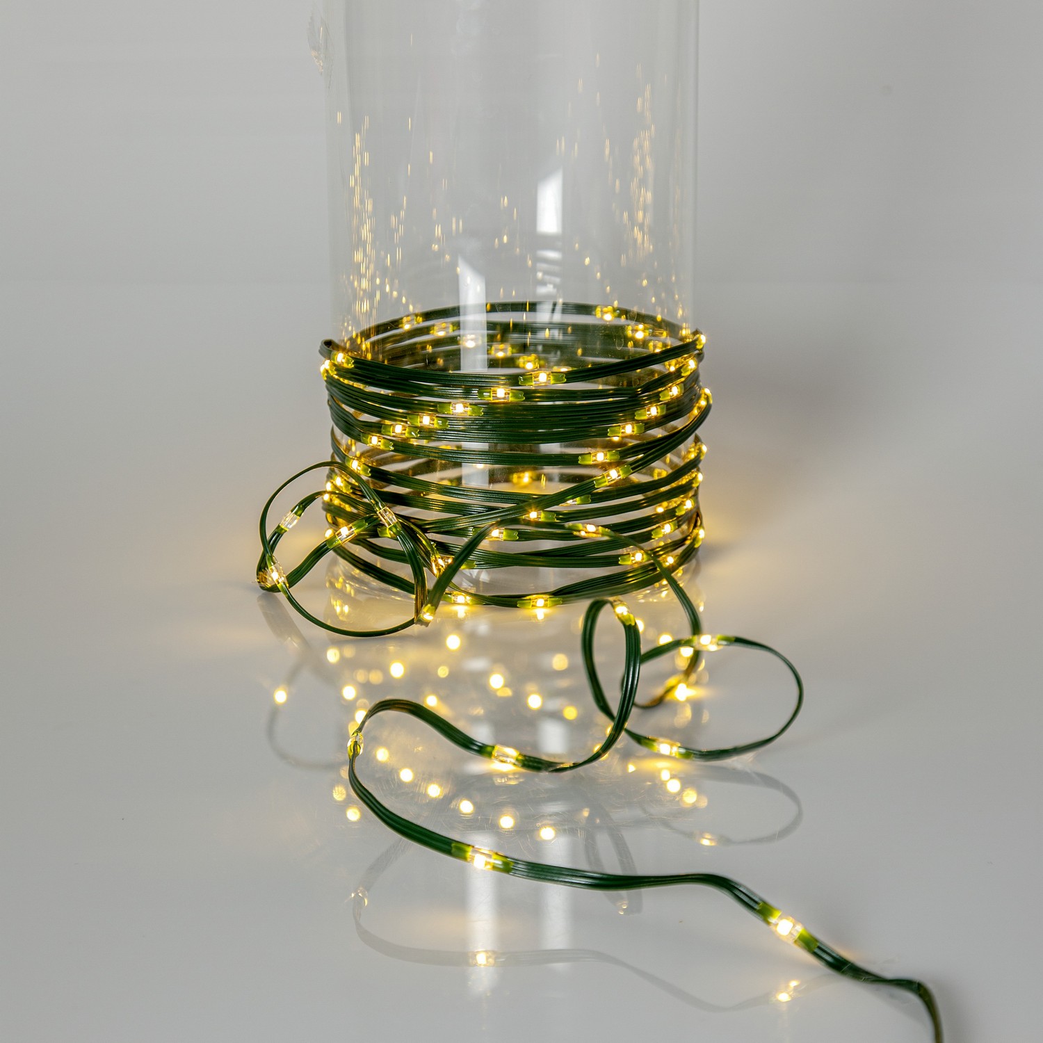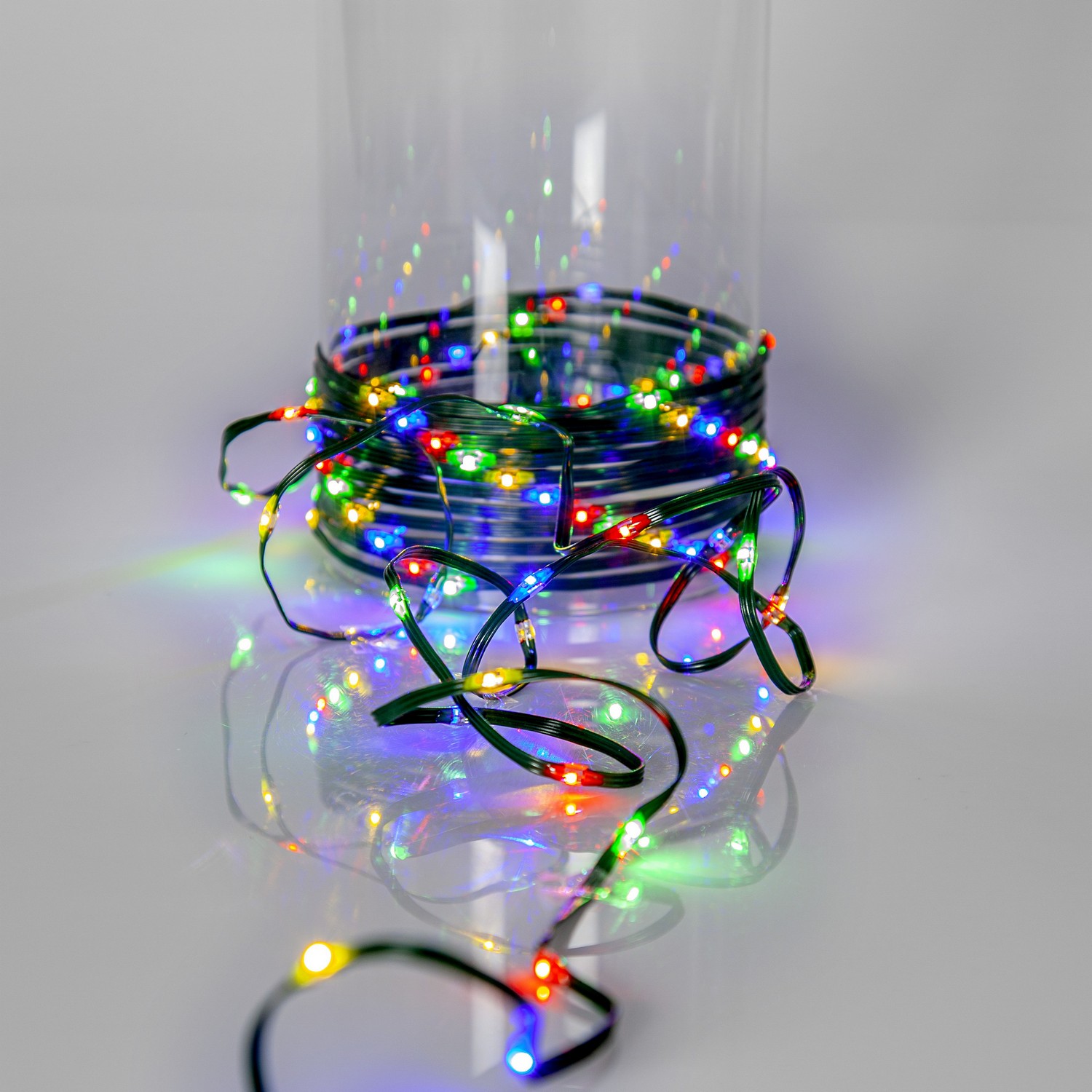 Tunn platt slinga med små ljuspunkter för utomhusbruk, perfekt och enkel att använda i träd, buskar, kransar, trappräcken mm. Grön kabel med 96 multifärgade LED, 7,5cm mellan varje lampa ger en slinga på ca 7m. 8 olika blinksekvenser varav en är med fast sken.