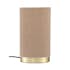 Stilren bordslampa med fastmonterad lampskärm som är gjord i veckat material av polyester och bomull. Laminatet på skärmens baksida är av polystyren plast. Bottenplattan är gjord i metall och lackerad i mattguld färg.