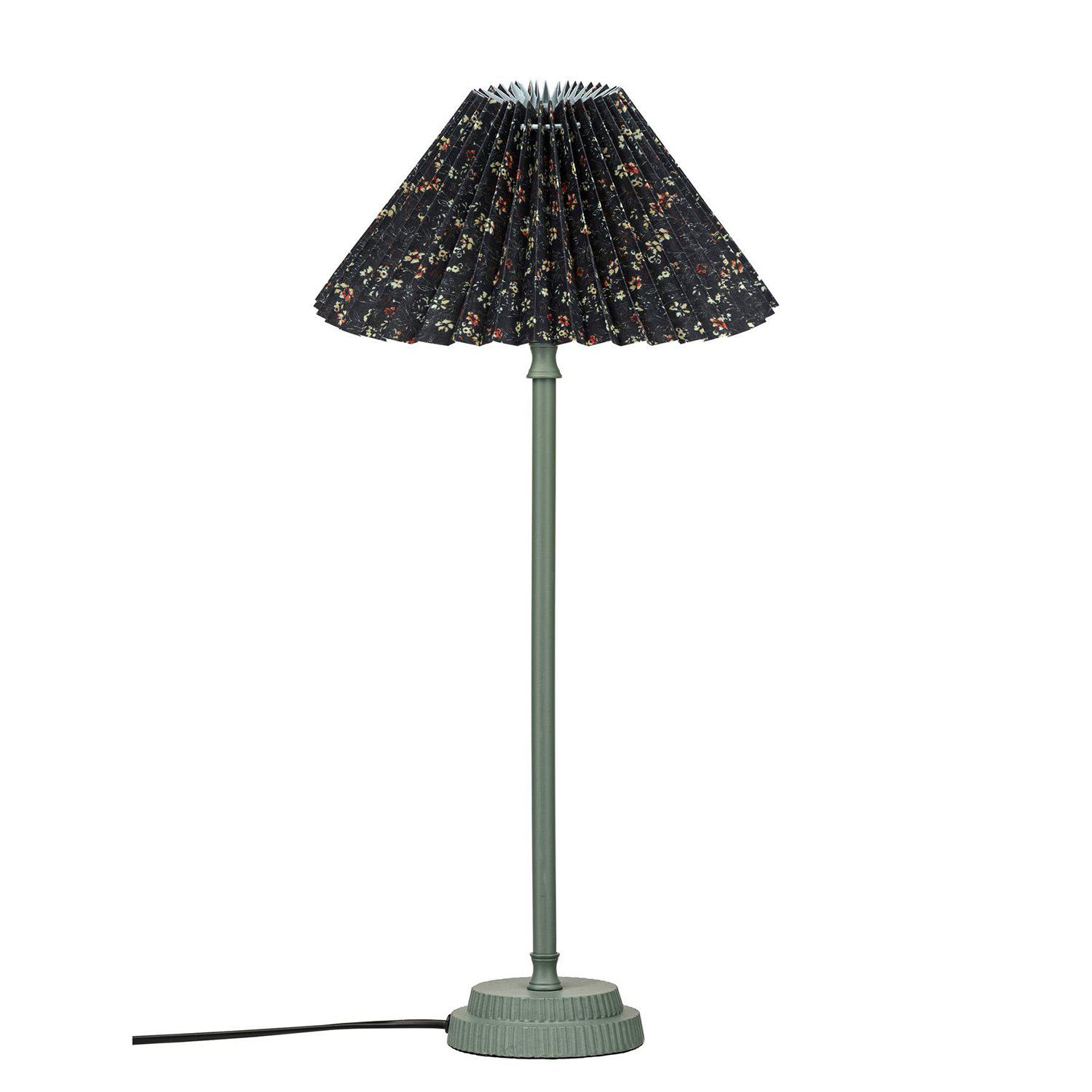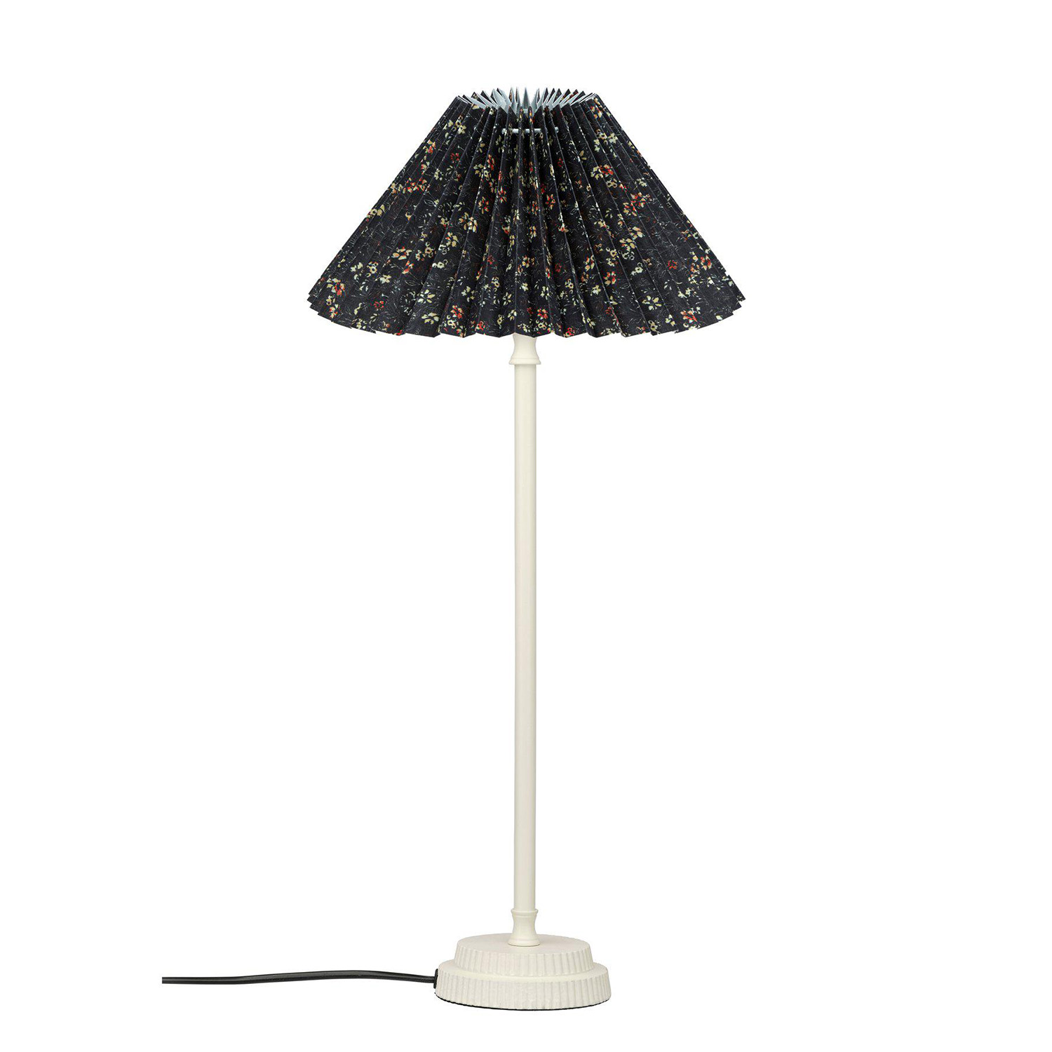 Kent lampfot med den veckade lampskärmen Ines i ett småblommigt ekologiskt bomullstyg. Skärmen är 25 cm bred och 14cm hög och har ett vändbart E27 ringfäste. Lampfoten är 45cm hög och den totala höjden blir 55 cm. 1,5 m svart plastsladd med strömbrytare. E27 sockel. Max 40W. IP20. Ljuskälla köpes separat.