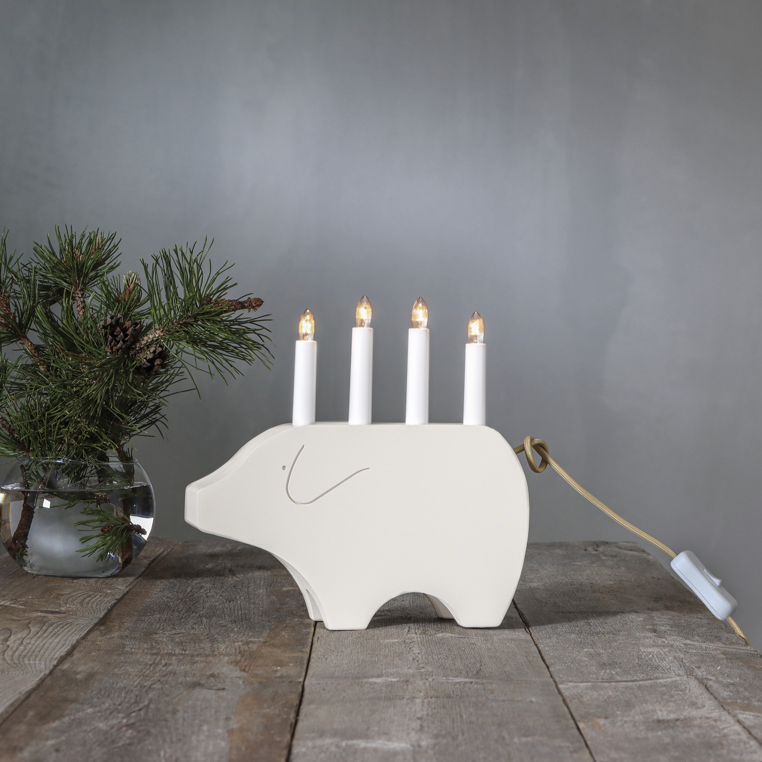 Adventsljusstake i form av en vit julgris, tillverkad i trä. Textilkabel med brytare. Placera den i ett fönster eller och på en skänk. Härlig adventsljusstake att dekorera med till jul.