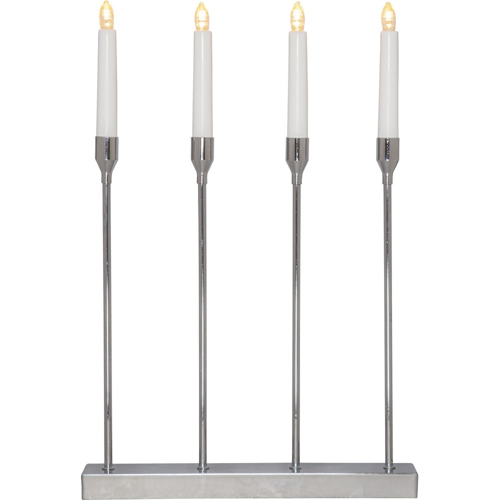 Modern batteri driven adventsljusstake i mässings färg, tillverkad i metall. Perfekt dekoration för platser där inte el är tillgängligt. Ljusstaken är batteridriven. Dekorera med till advent och jul, placera den i ett fönster eller på en skänk.
