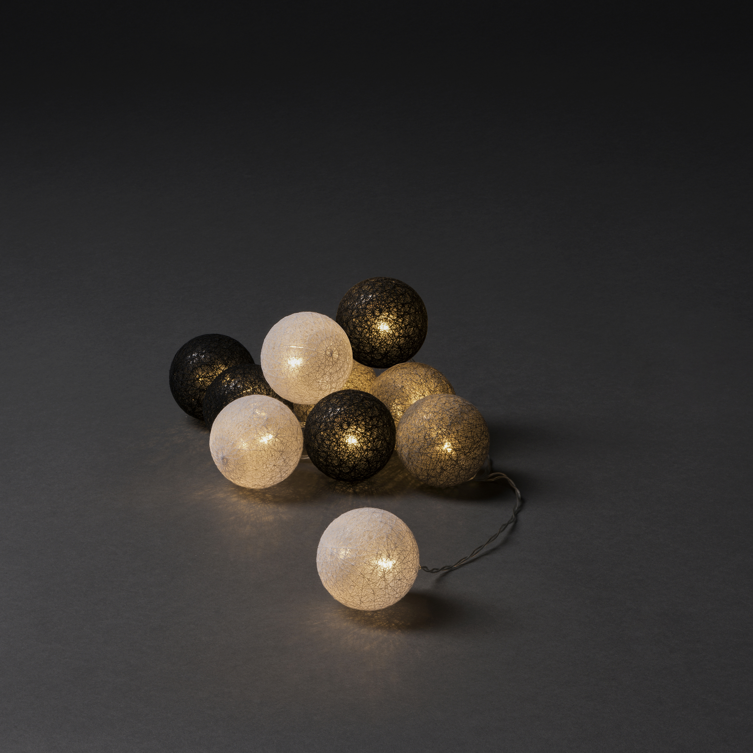 Ljusslinga från Gnosjö Konstsmide med garnbollar, varmvita LED-ljus och timer på sex timmar.