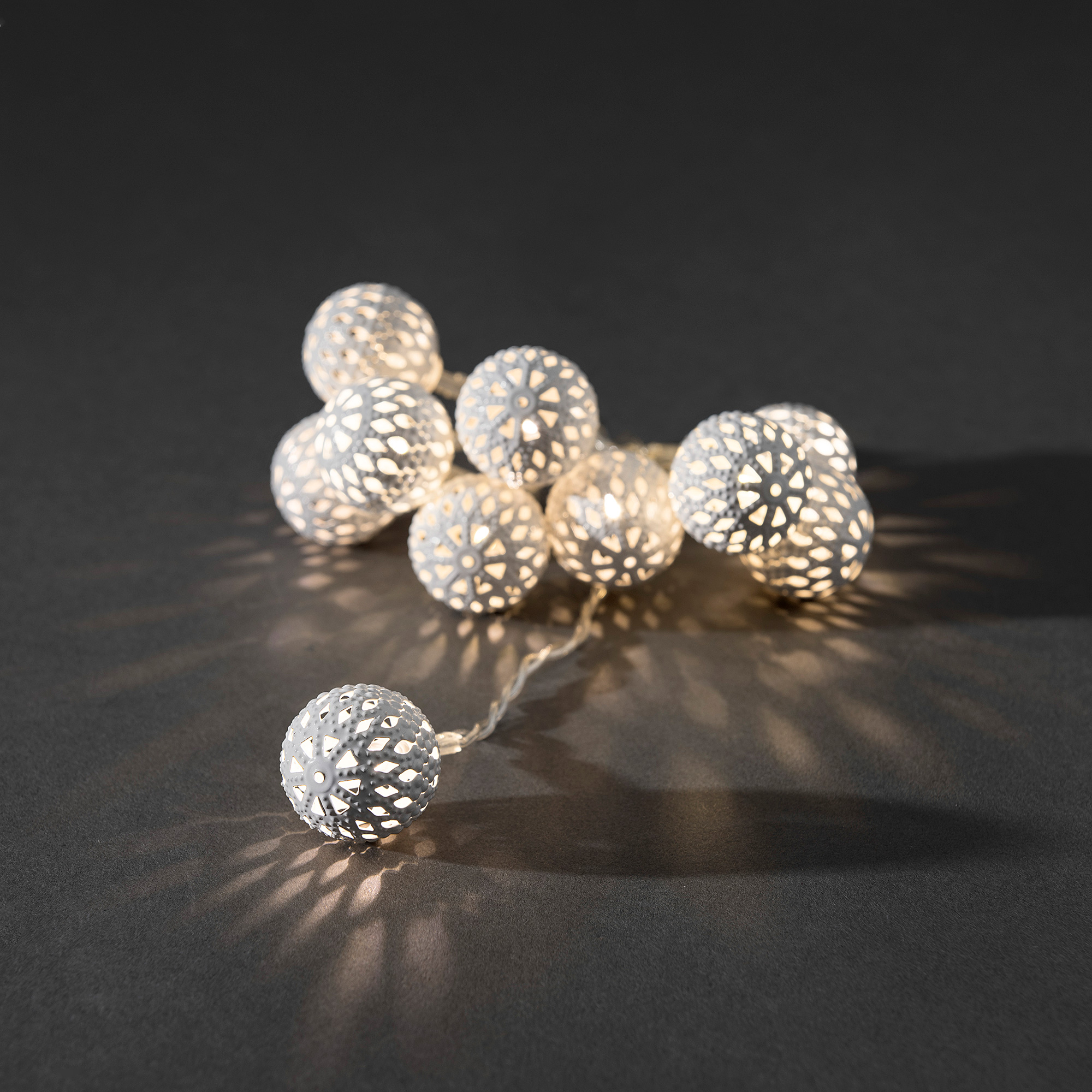Ljusslinga från Gnosjö Konstsmide med 24 st metallbollar med varmvit LED-belysning. Slingan är 6 m lång och har en 3 m anslutningssladd till första lampan.