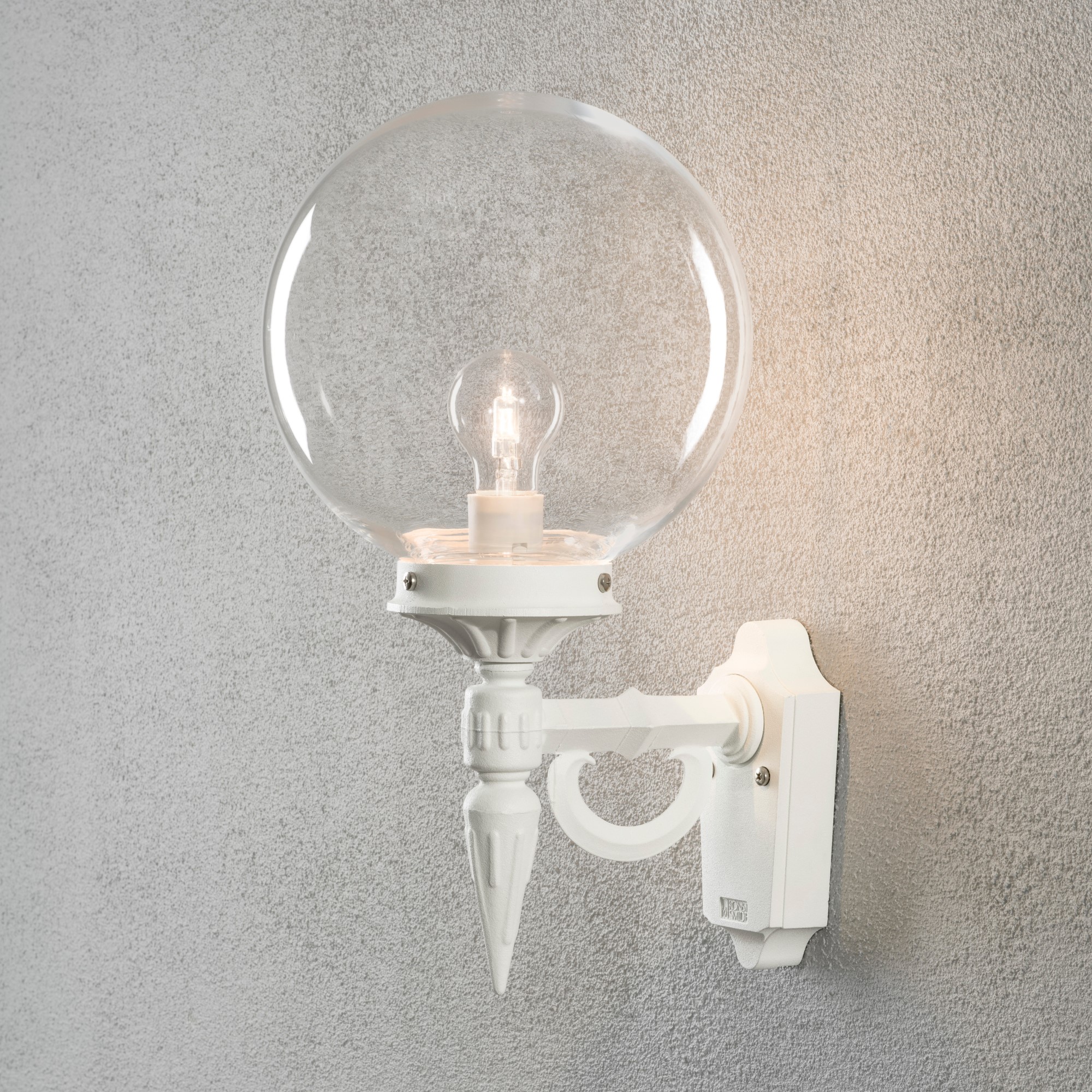 Vägglykta Gnosjö Konstsmide Orion E27 är en elegant fasadbelysning i klassisk design. Den har en stor kupa i klart utförande och levereras utan ljuskälla.