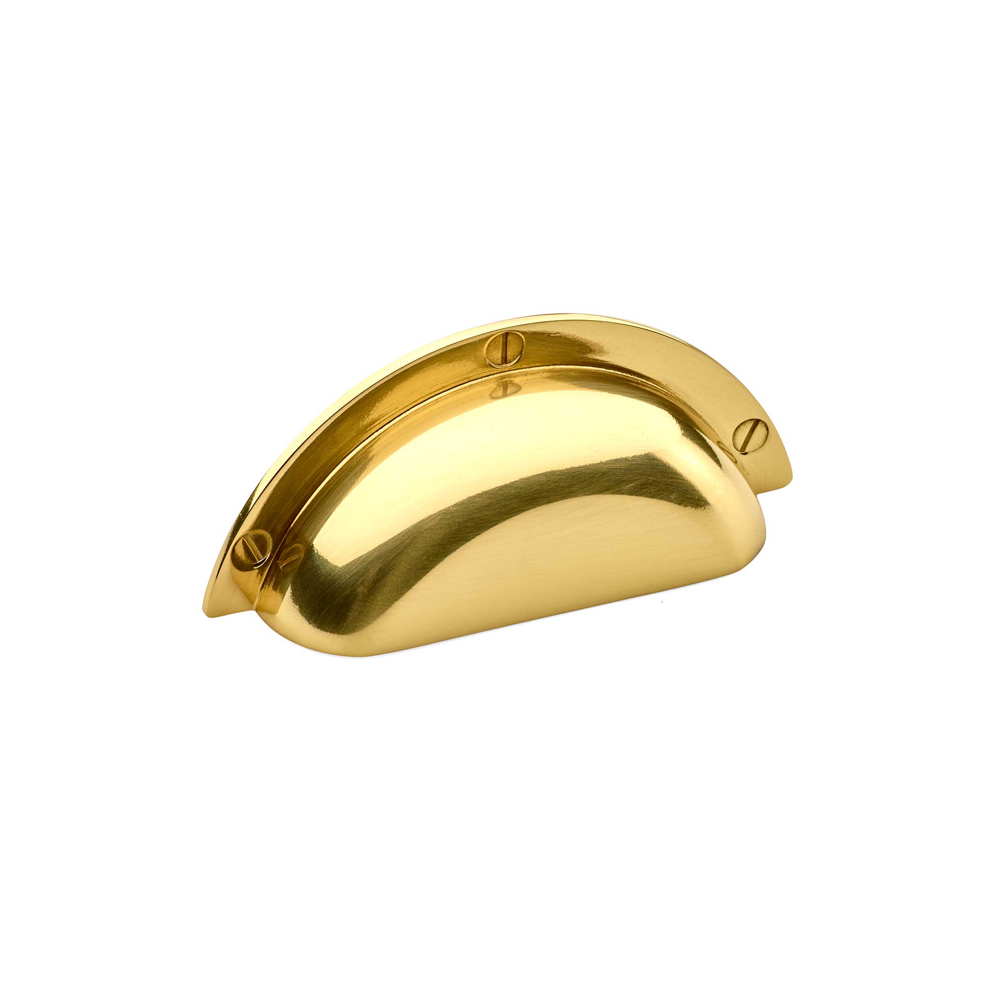 Kökshandtag tillverkat av återvunnen mässing. Handtaget har rund skålform och passar särskilt till lådor i byråer och hurtsar men också till köket. Skruvar medföljer.