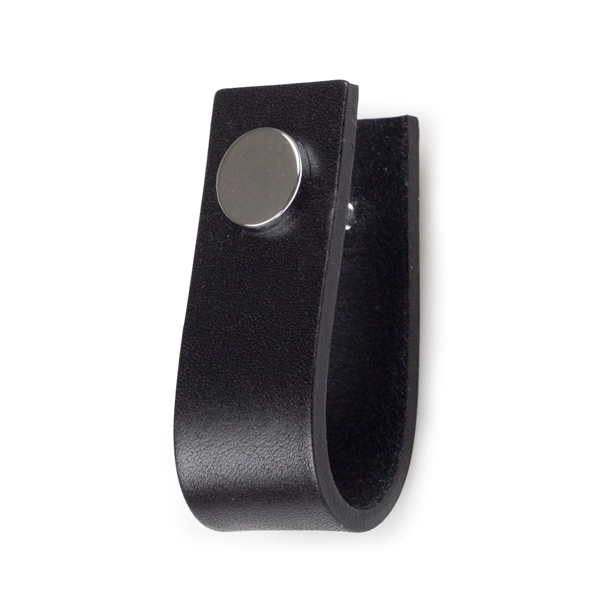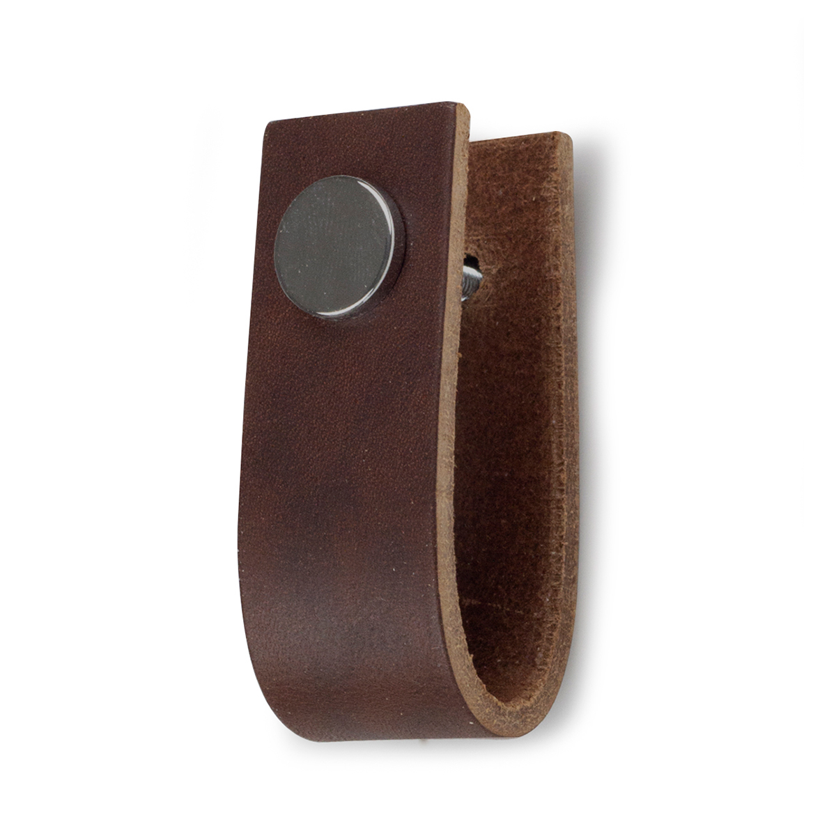Kökshandtag från Habo. Tillverkat av naturgarvat läder från Tärnsjö garveri. Knopp i blank krom. Lämplig för lucktjocklek 16-20 mm.