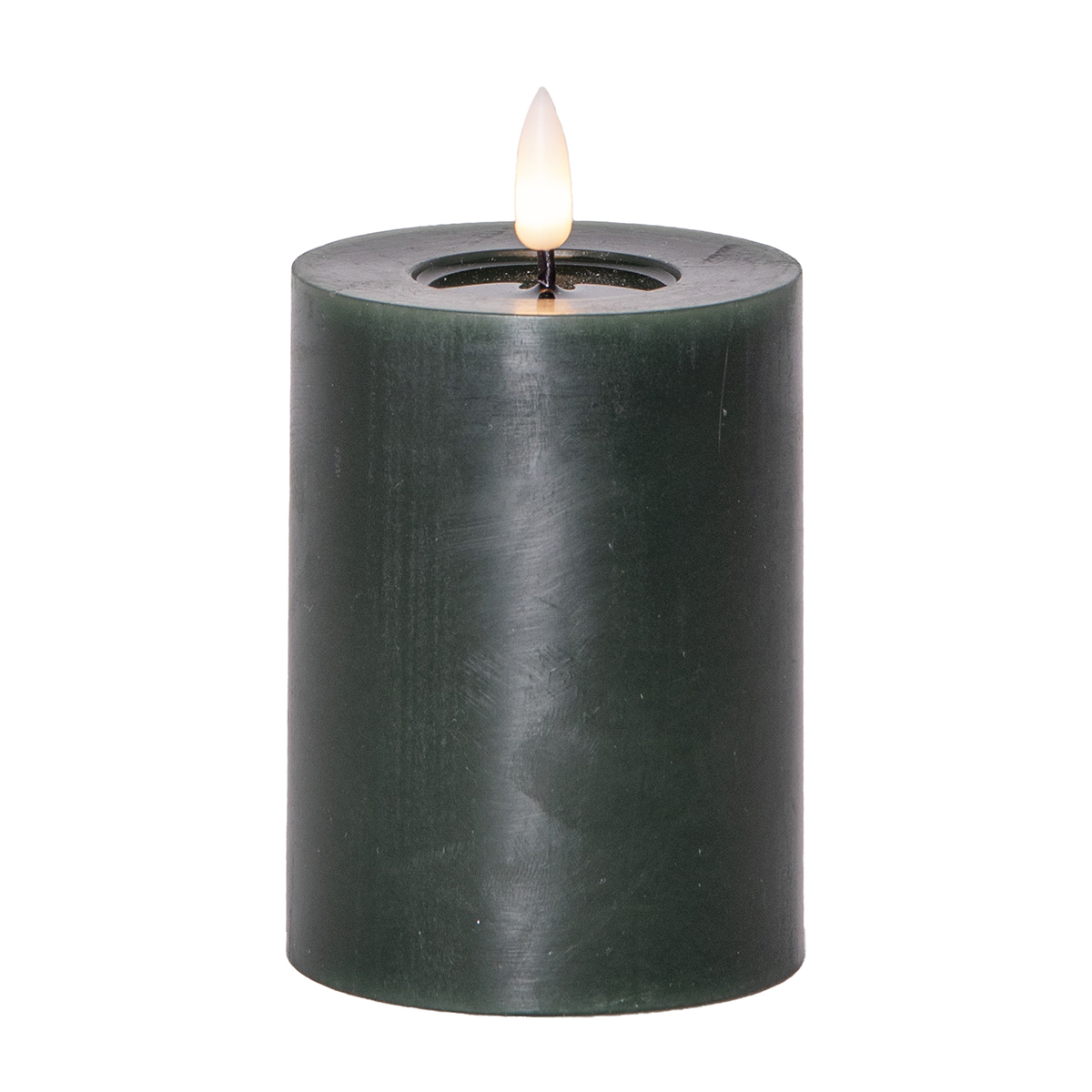 Detta stearinljus har en blank nedsänkning under lågan, denna yta ser ut som flytande vax vilket gör ljuset än mer naturtroget. Ljuset är cirka 7,5cm i diameter och höjden 10cm för vax delen och cirka 12,5cm med lågan. Detta ledljus blir en vacker dekoration, både ensam och i grupp ihop med övriga ljus från vår Flamme serie. Den har timerfunktion och när brytaren är på timerläget lyser ljuset i ca 250 dagar med en vacker realistisk låga i varmvitt. Den drivs av 2 AA batterier, dessa ingår ej. Undvik att ställa ljusen i direkt solljus då de kan smälta och missfärgas av värmen.