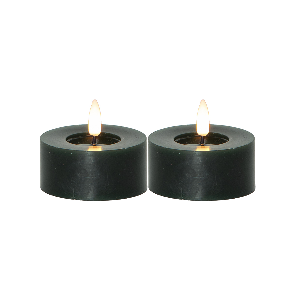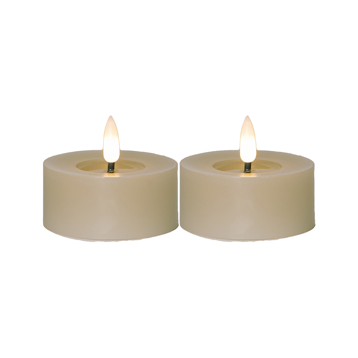 Flamme Flow är ett 2 pack batteridrivet värmeljus i paraffinvax i en större storlek; 7x5,5cm inklusive lågan.