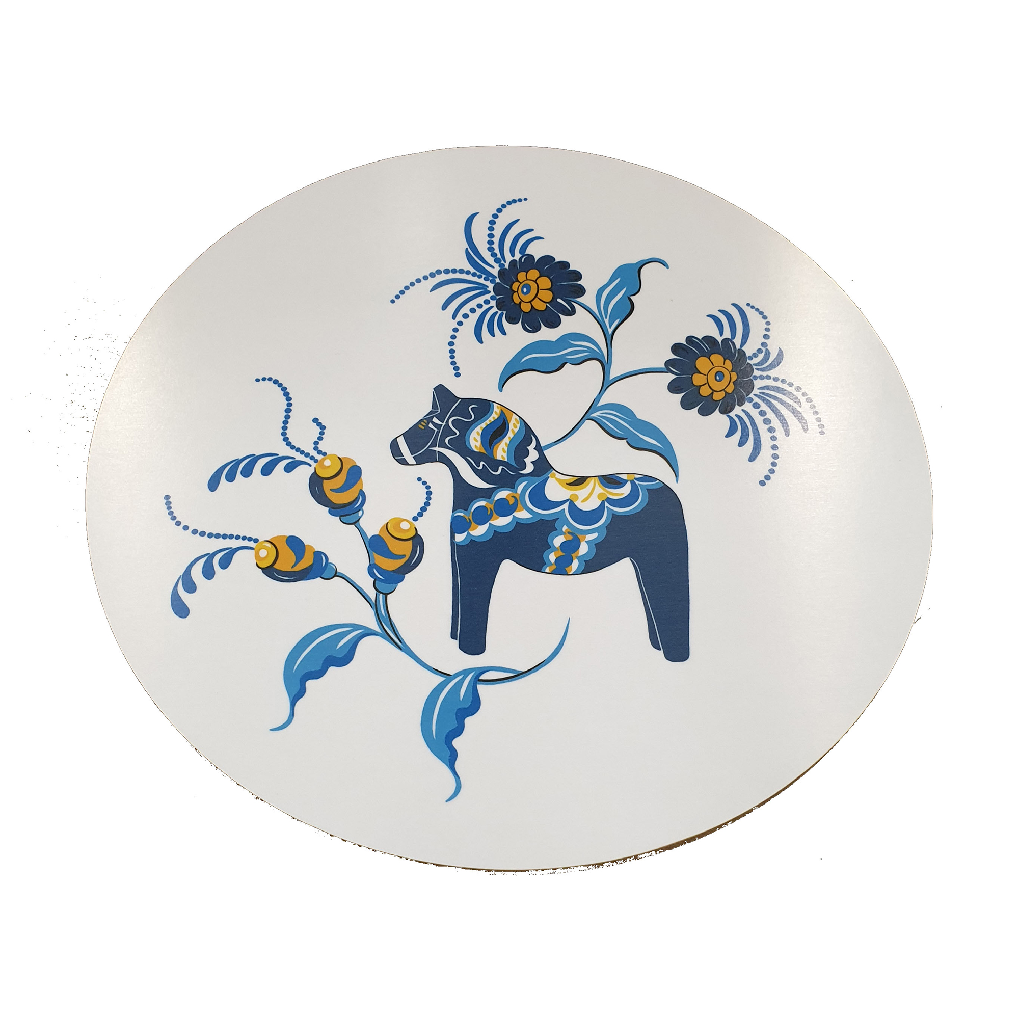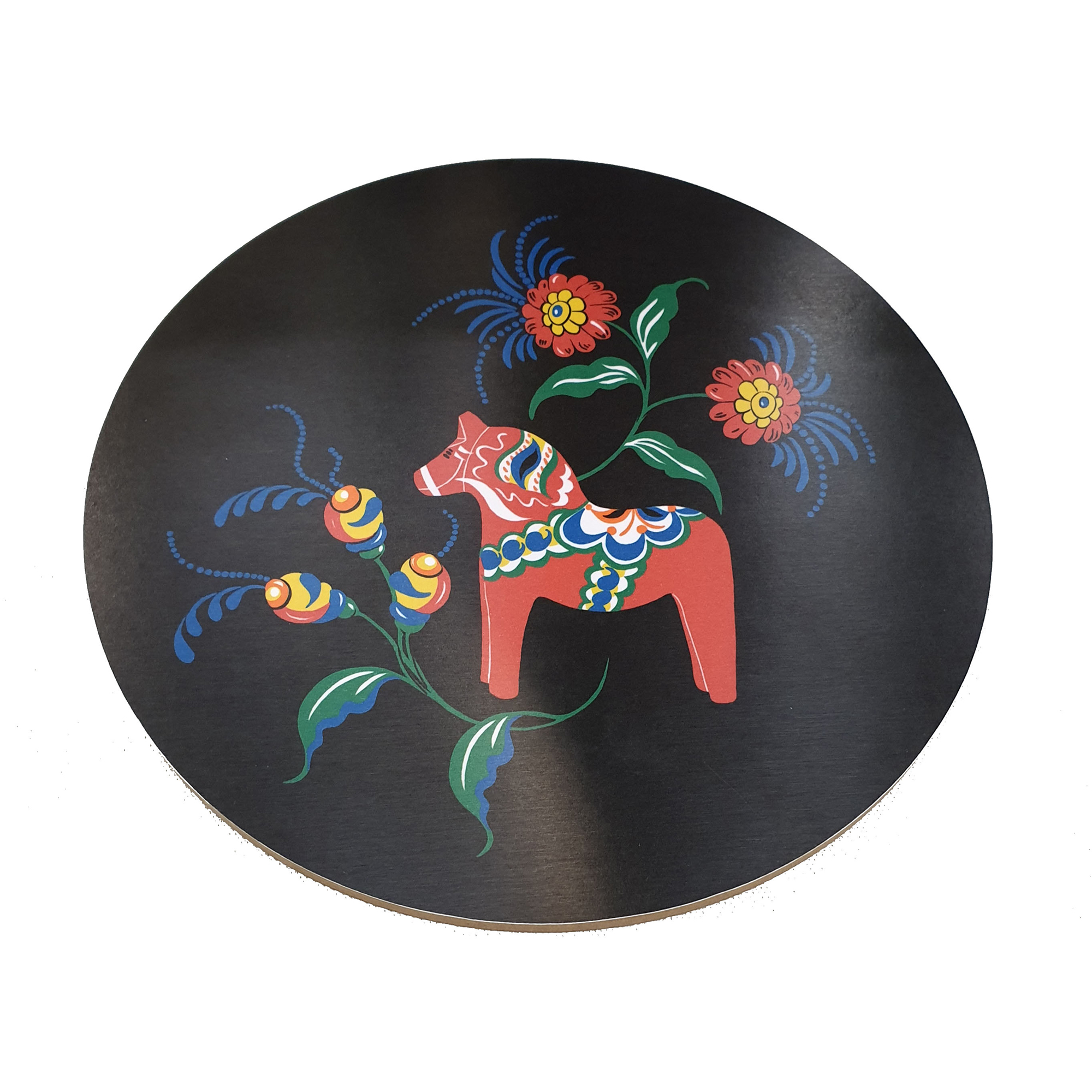 Grytunderlägg Leksand från Arvidssons Textil. Svenskdesignat mönster av Carola Bengtsson-Malmström. Med dalahästar och kurbitsmotiv i glada färger. Tillverkad i Sverige.