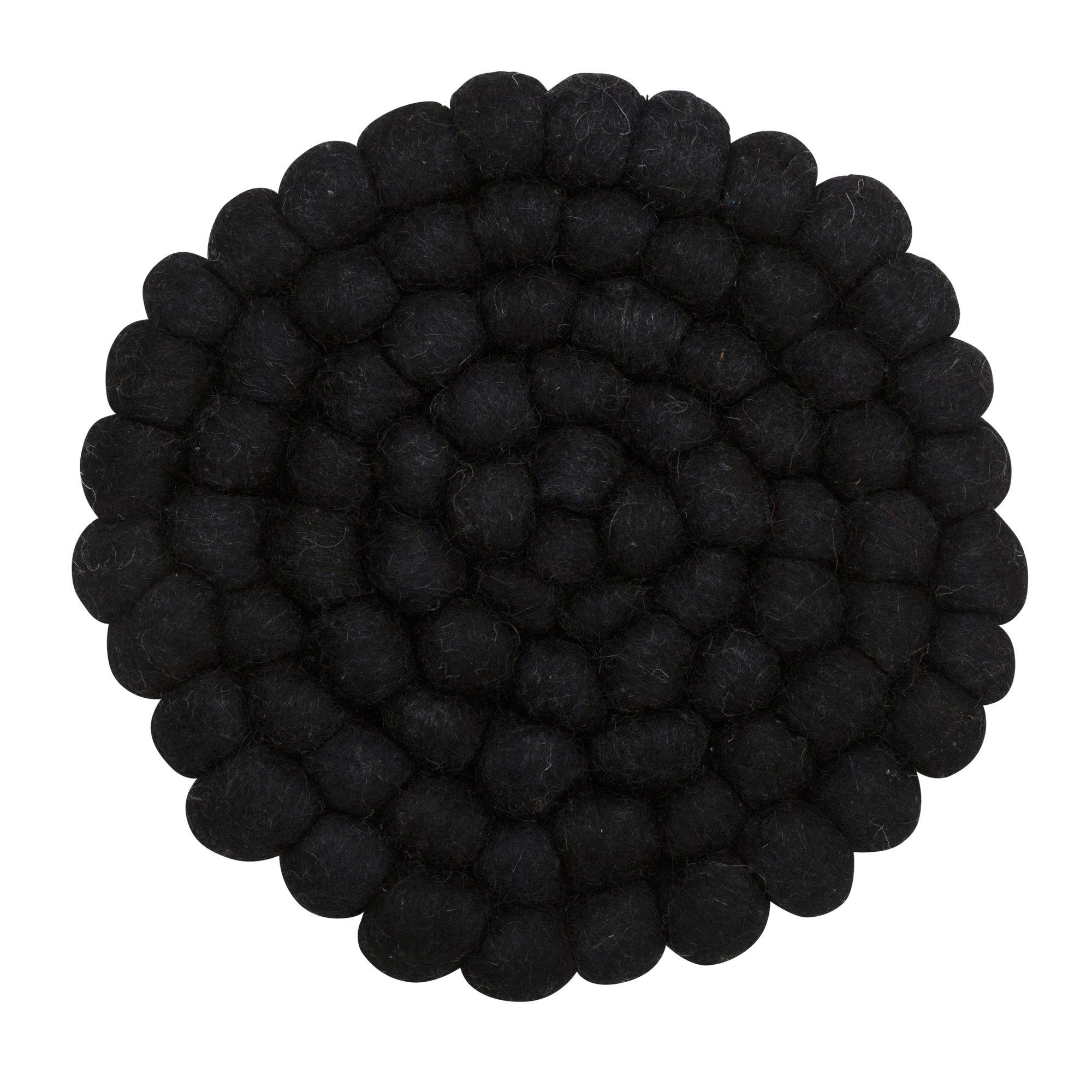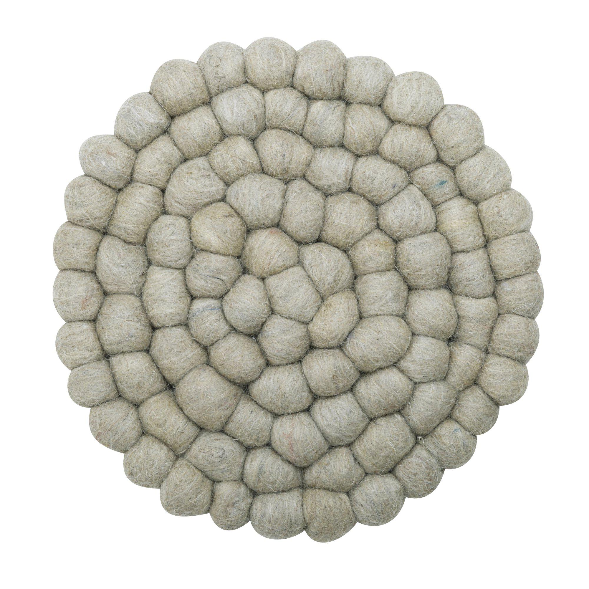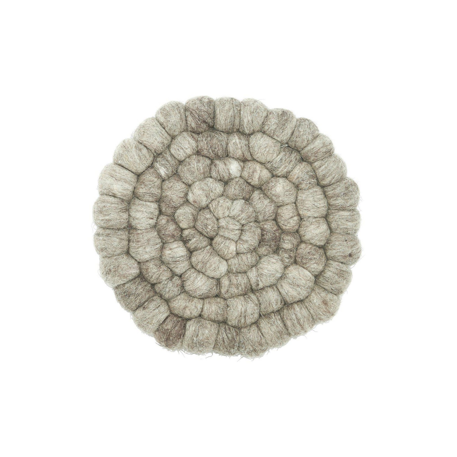 Grytunderlägg i ull med tovade bollar, för att skydda bordet mot varma kärl. 20cm i diameter.