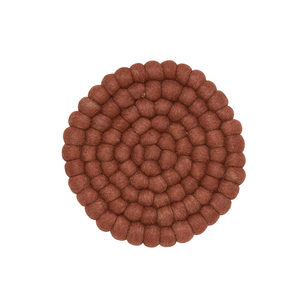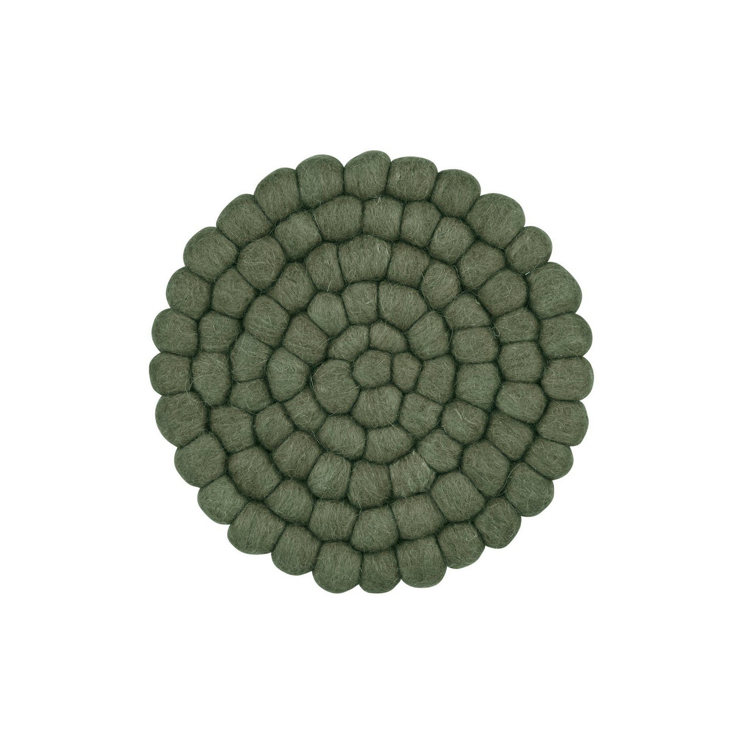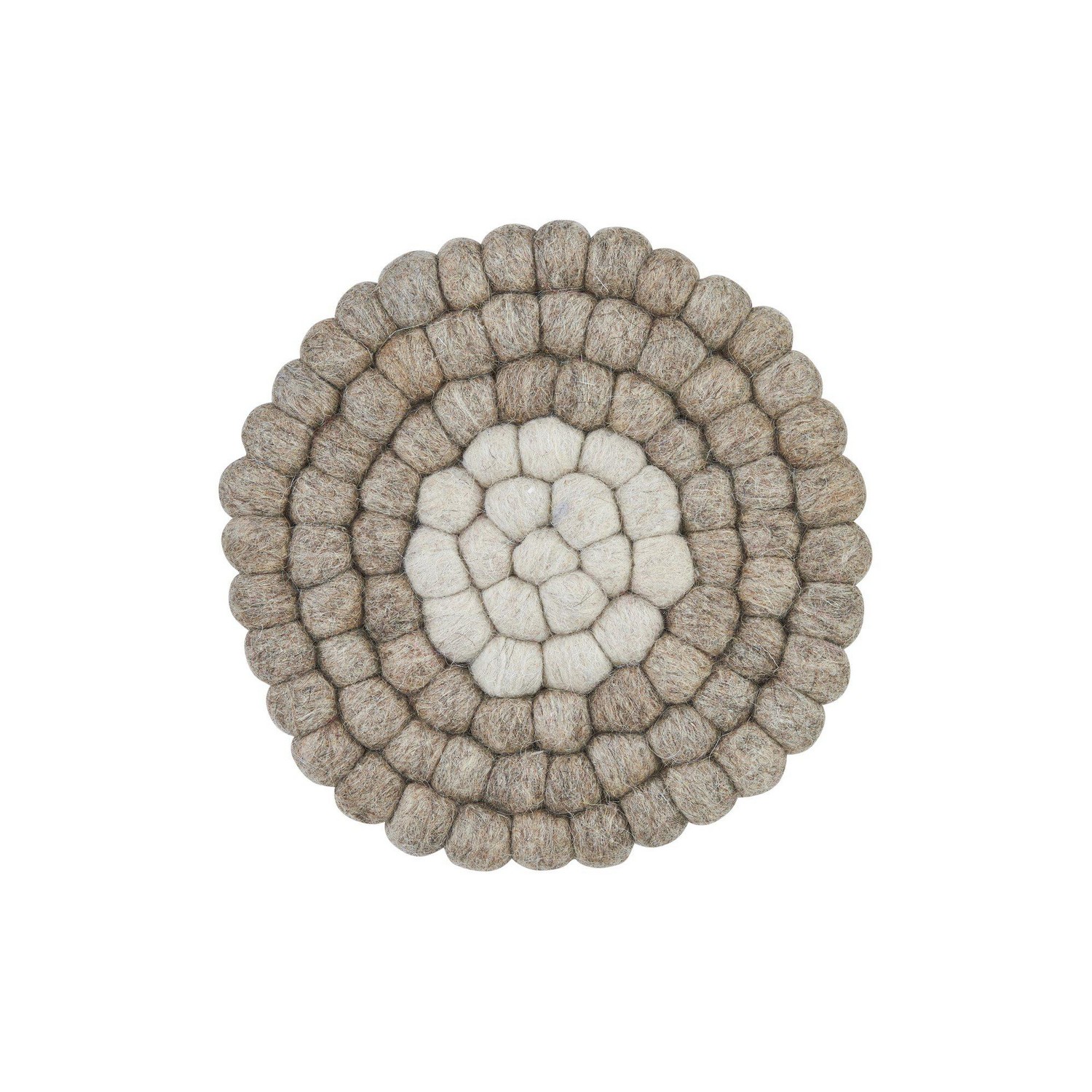 Grytunderlägg i ull med tovade bollar, för att skydda bordet mot varma kärl. 20cm i diameter.