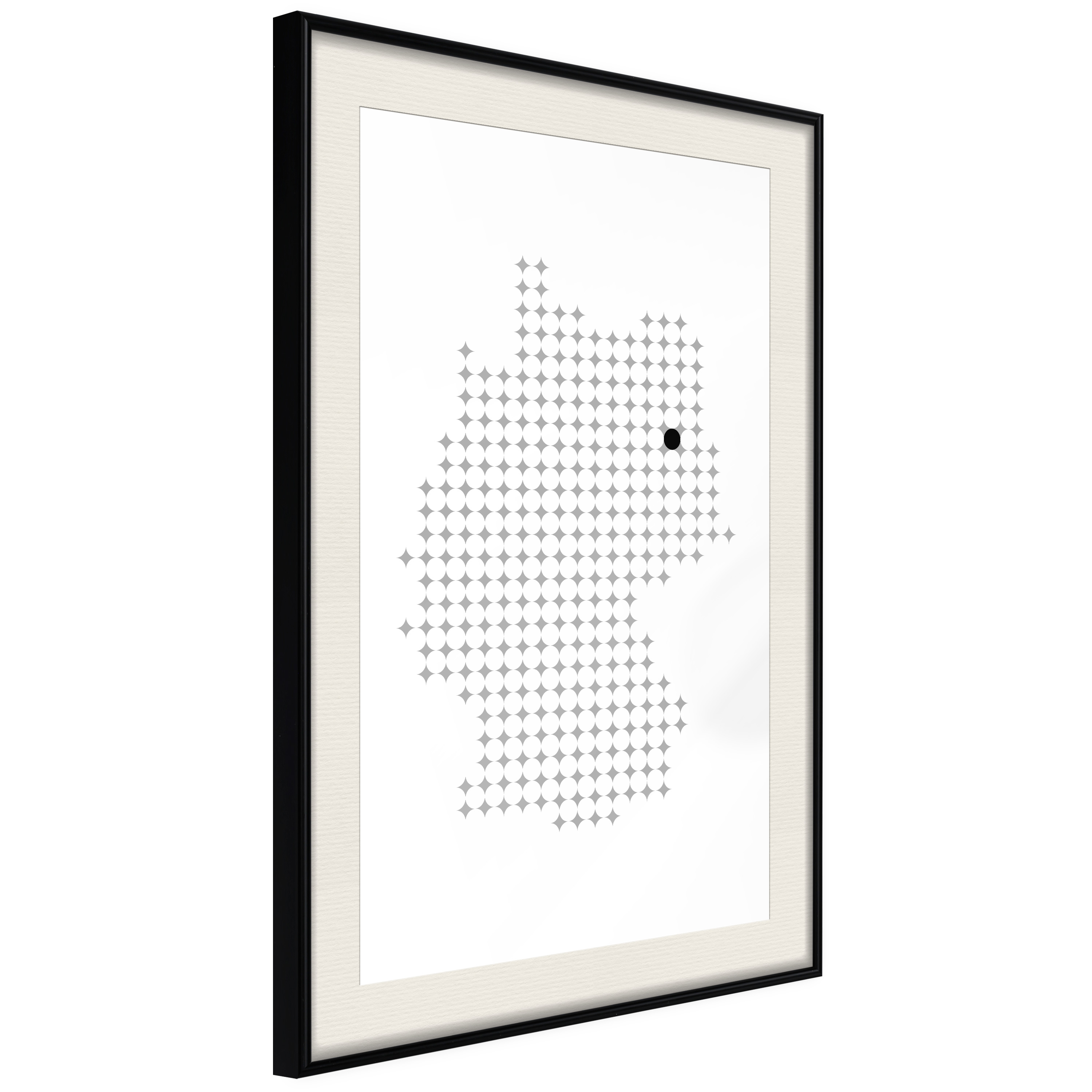 Passepartouten i écru betonar färgern på affischen och skapar en extra kontrast mellan grafiken, ramen och väggen. Dessutom ger den ramen ett svagt tredimensionellt intryck och fungerar även som ett skyddslager som ytterligare skyddar afischen. Affischen är säkrad med akrylglas och en hänganordning finns på ramens baksida.