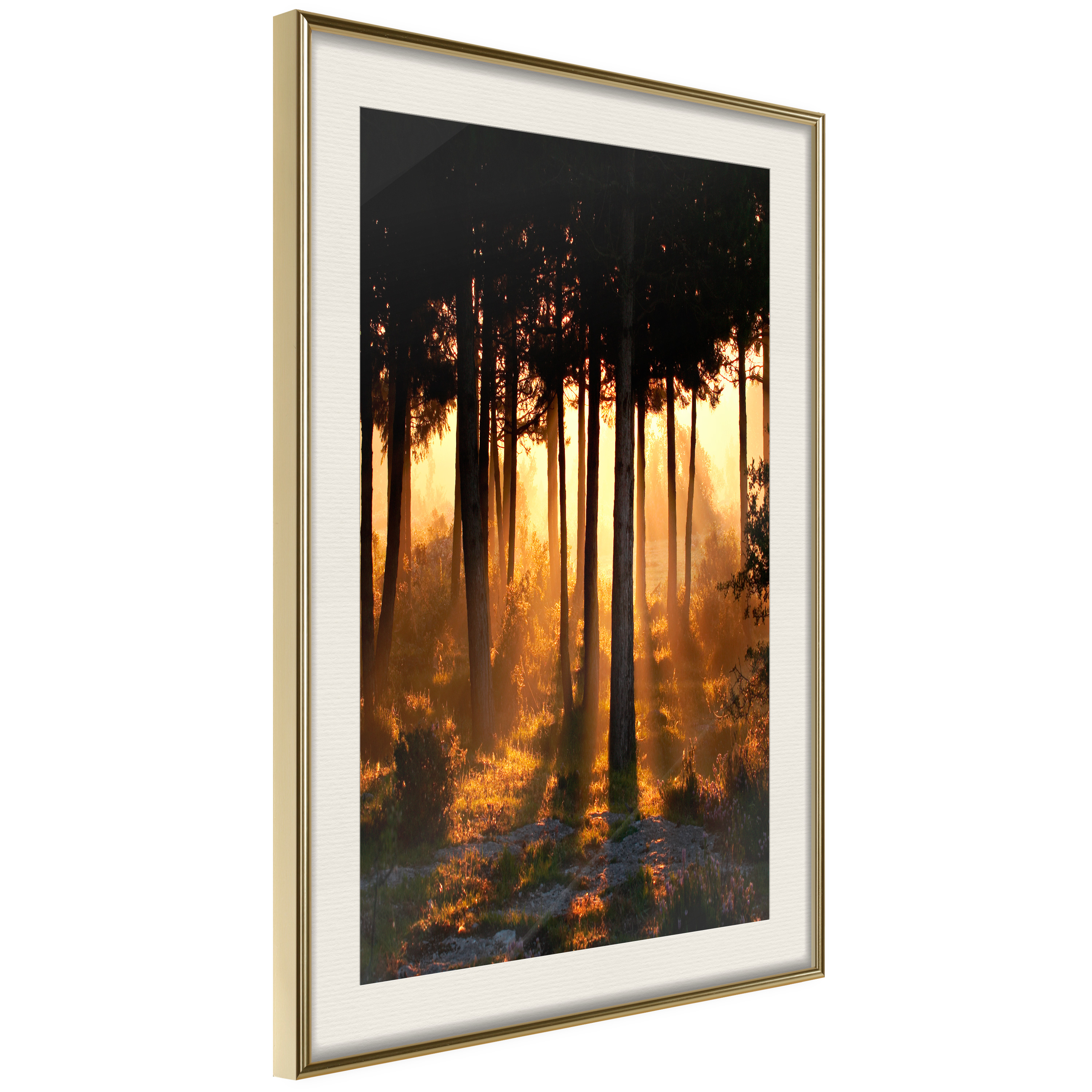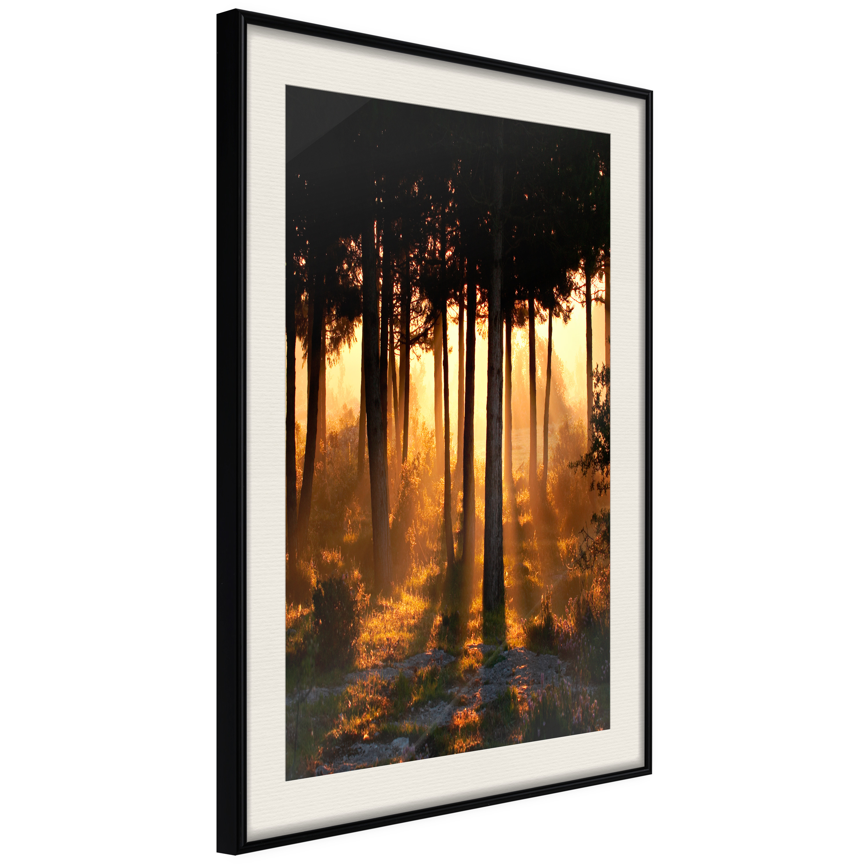 Passepartouten i écru betonar färgern på affischen och skapar en extra kontrast mellan grafiken, ramen och väggen. Dessutom ger den ramen ett svagt tredimensionellt intryck och fungerar även som ett skyddslager som ytterligare skyddar afischen. Affischen är säkrad med akrylglas och en hänganordning finns på ramens baksida.