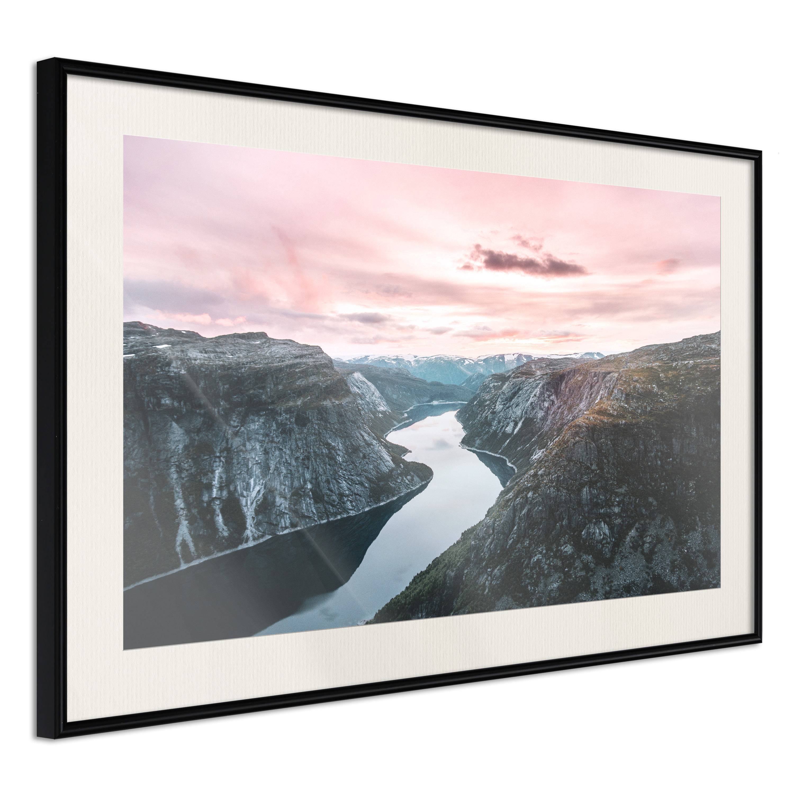Passepartouten i écru betonar färgern på affischen och skapar en extra kontrast mellan grafiken, ramen och väggen. Dessutom ger den ramen ett svagt tredimensionellt intryck och fungerar även som ett skyddslager som ytterligare skyddar afischen. Affischen är säkrad med akrylglas och en hänganordning finns på ramens baksida.