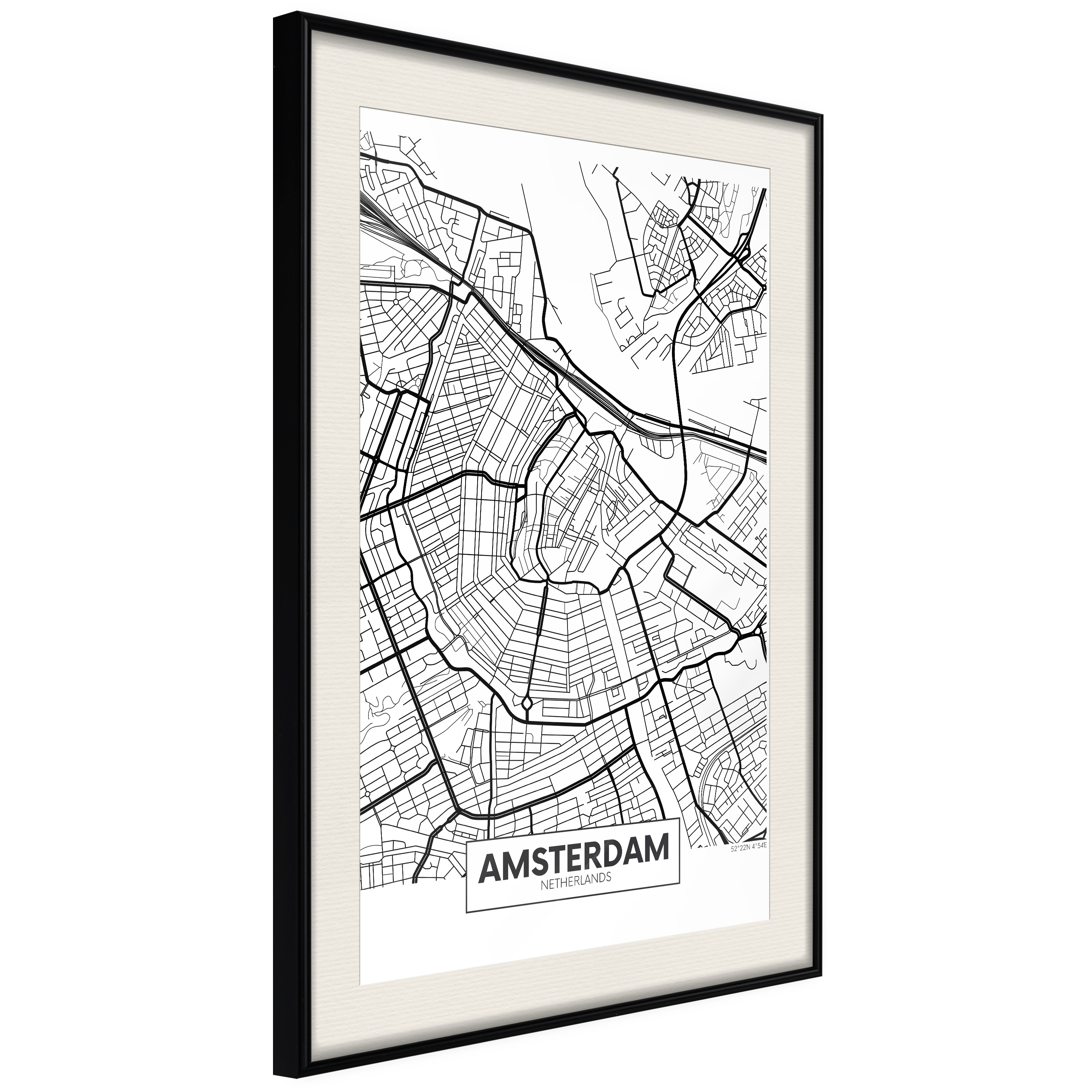 Passepartouten i écru betonar färgern på affischen och skapar en extra kontrast mellan grafiken, ramen och väggen. Dessutom ger den ramen ett svagt tredimensionellt intryck och fungerar även som ett skyddslager som ytterligare skyddar afischen. Affischen är säkrad med akrylglas och en hänganordning finns på ramens baksida.