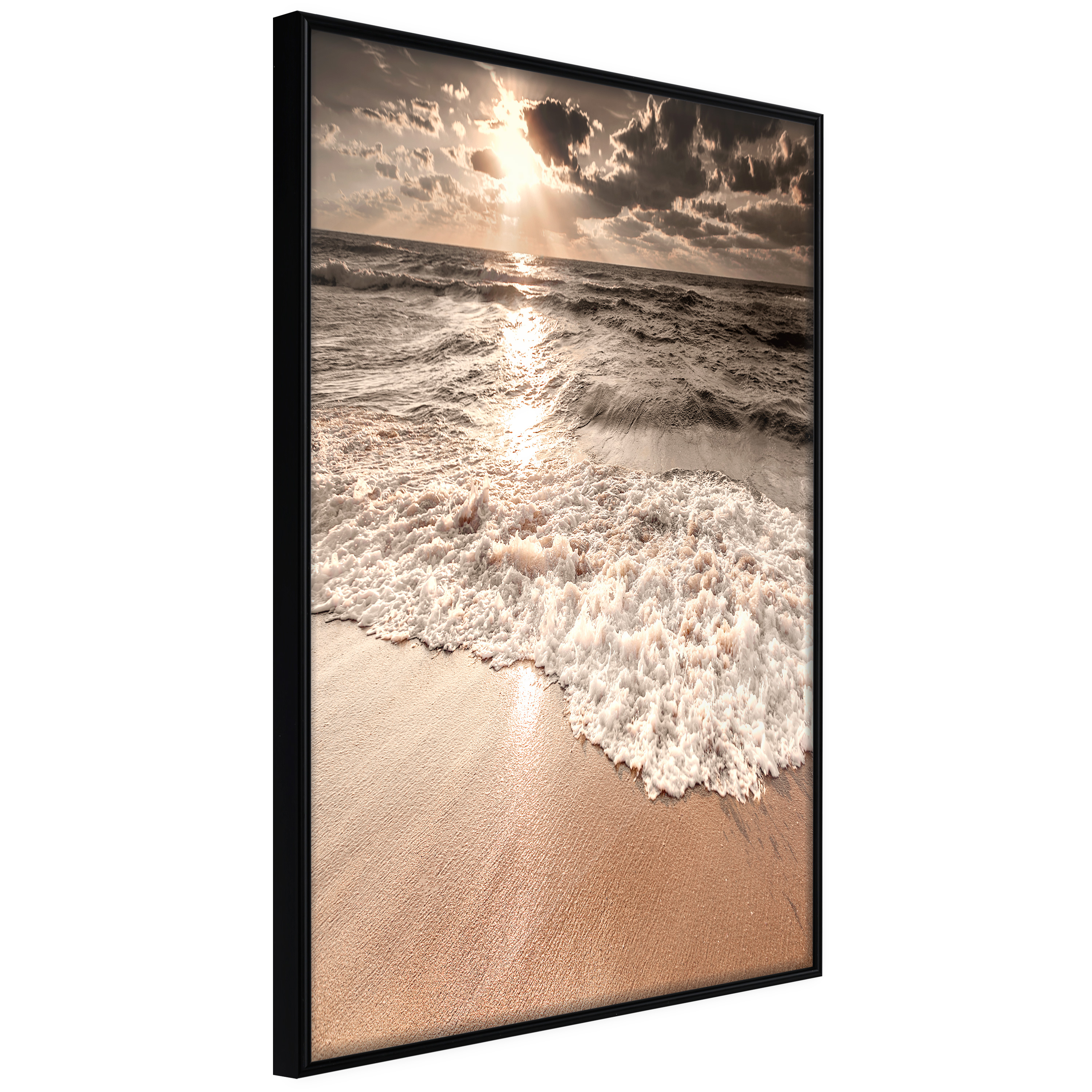 Passepartouten i écru betonar färgern på affischen och skapar en extra kontrast mellan grafiken, ramen och väggen. Dessutom ger den ramen ett svagt tredimensionellt intryck och fungerar även som ett skyddslager som ytterligare skyddar afischen. Affischen är säkrad med akrylglas och en hänganordning finns på ramens baksida.