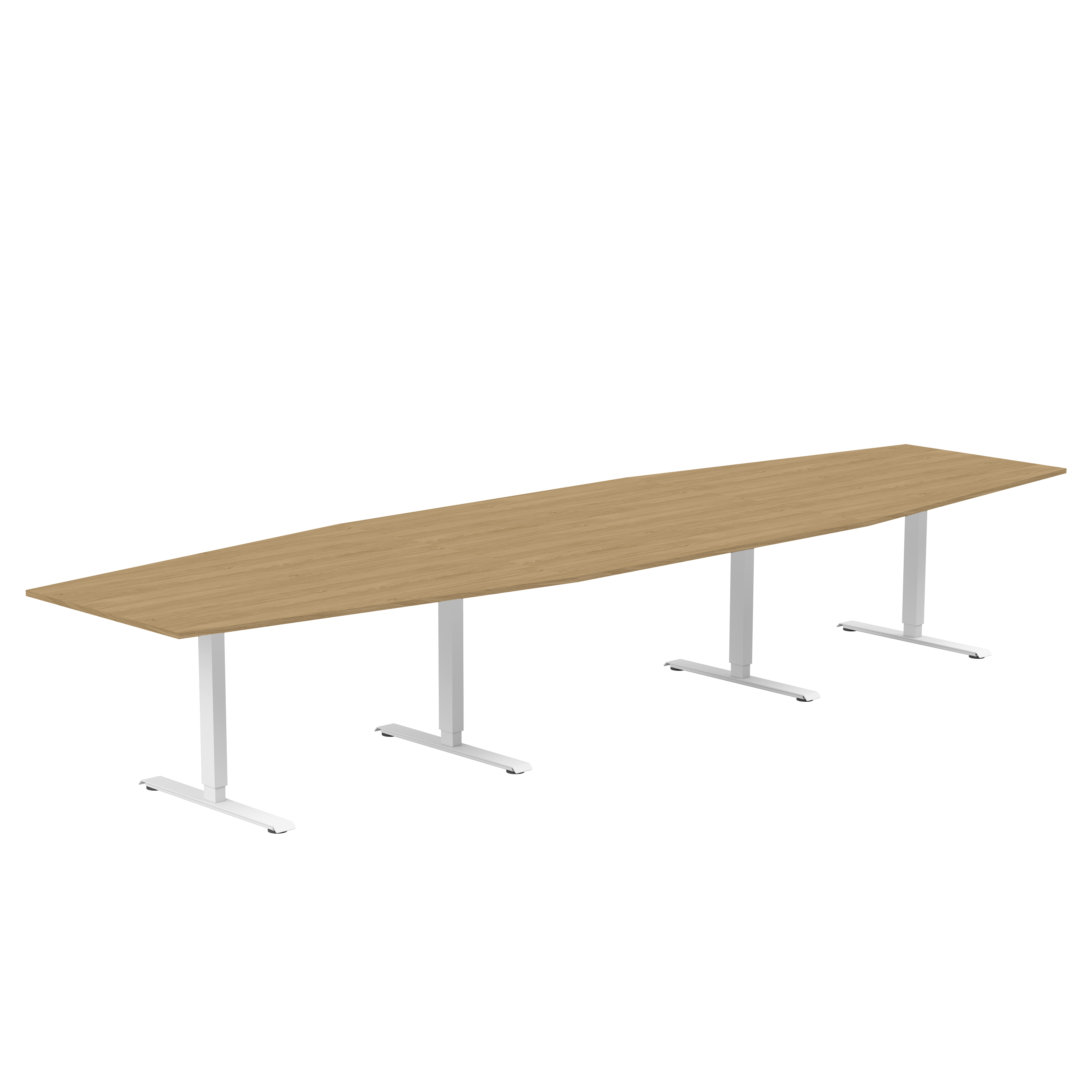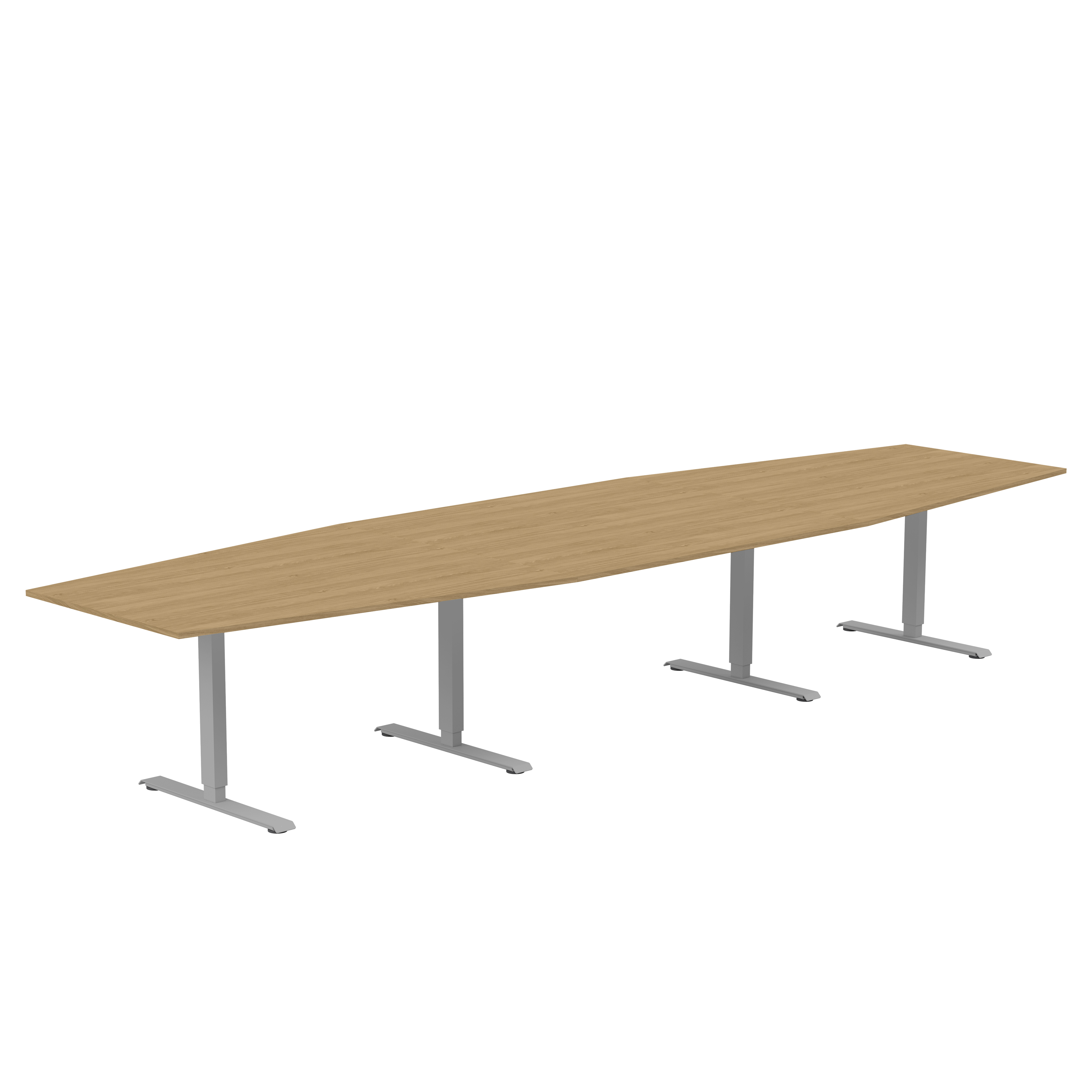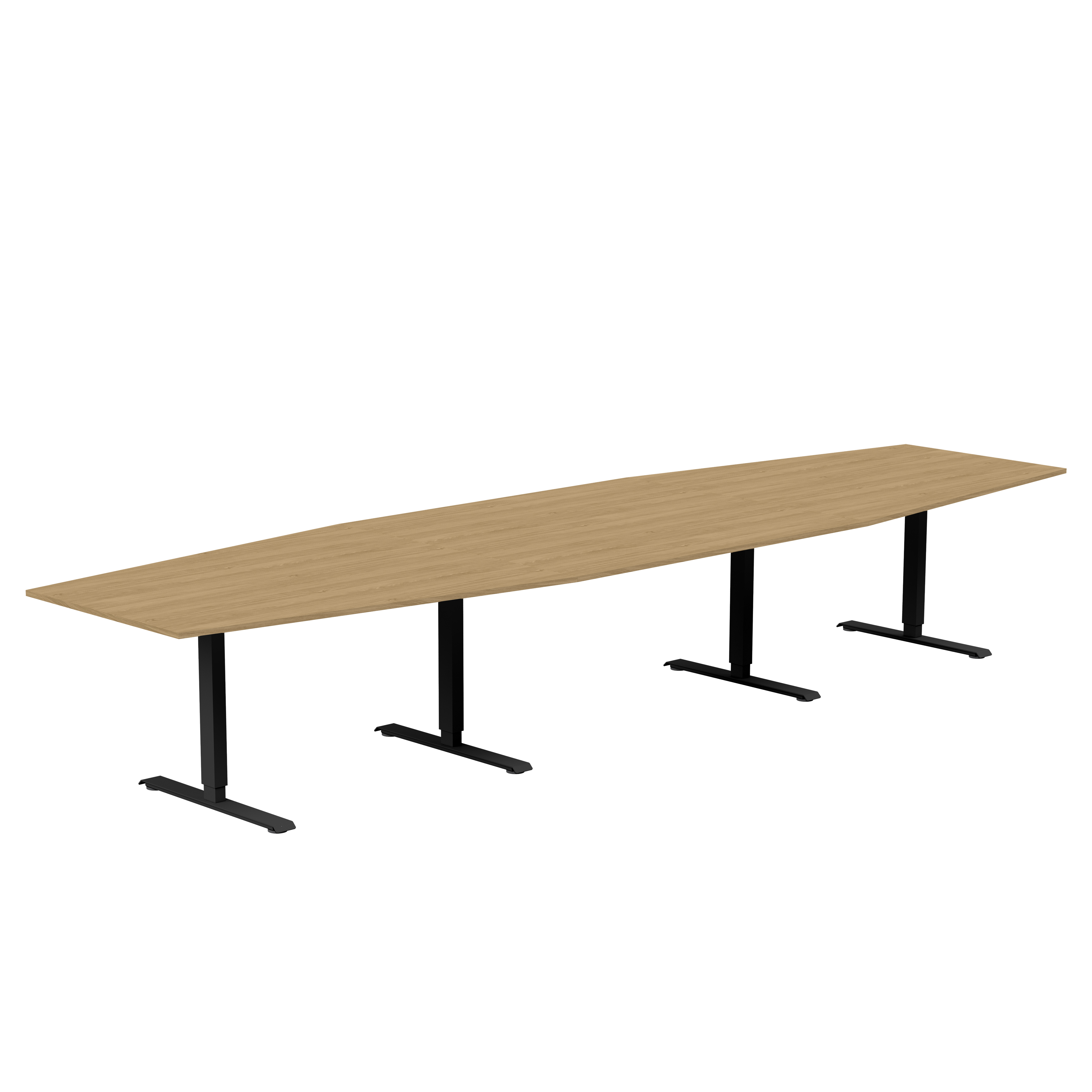Båtformat konferensbord för cirka 14 personer. Bordet har en stilren design med rektangulärt T-stativ och finns med flera sorters bordsskivor och i tre stativfärger. Bordshöjden kan ställas in manuellt så arbetshöjden kan justeras om det behövs.
