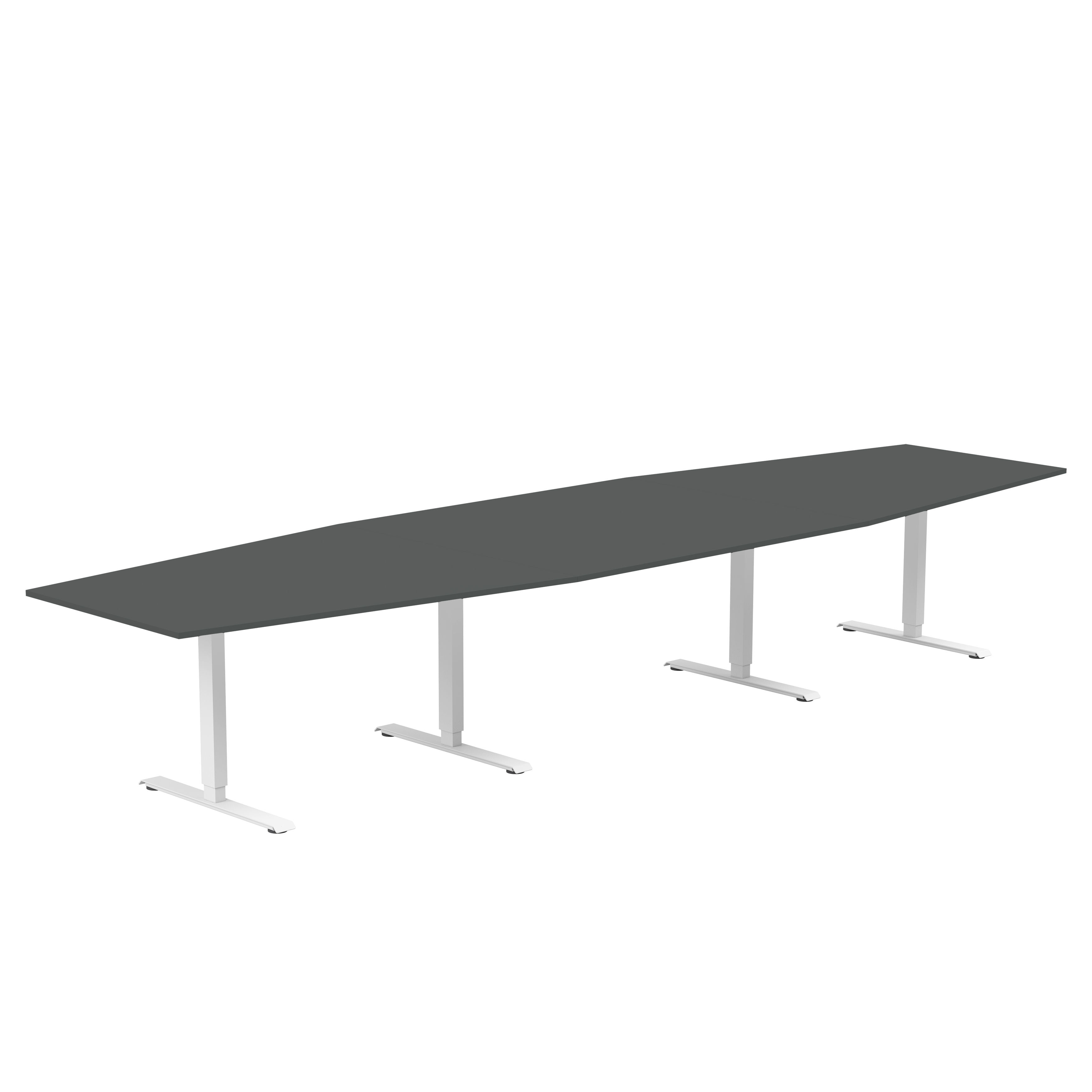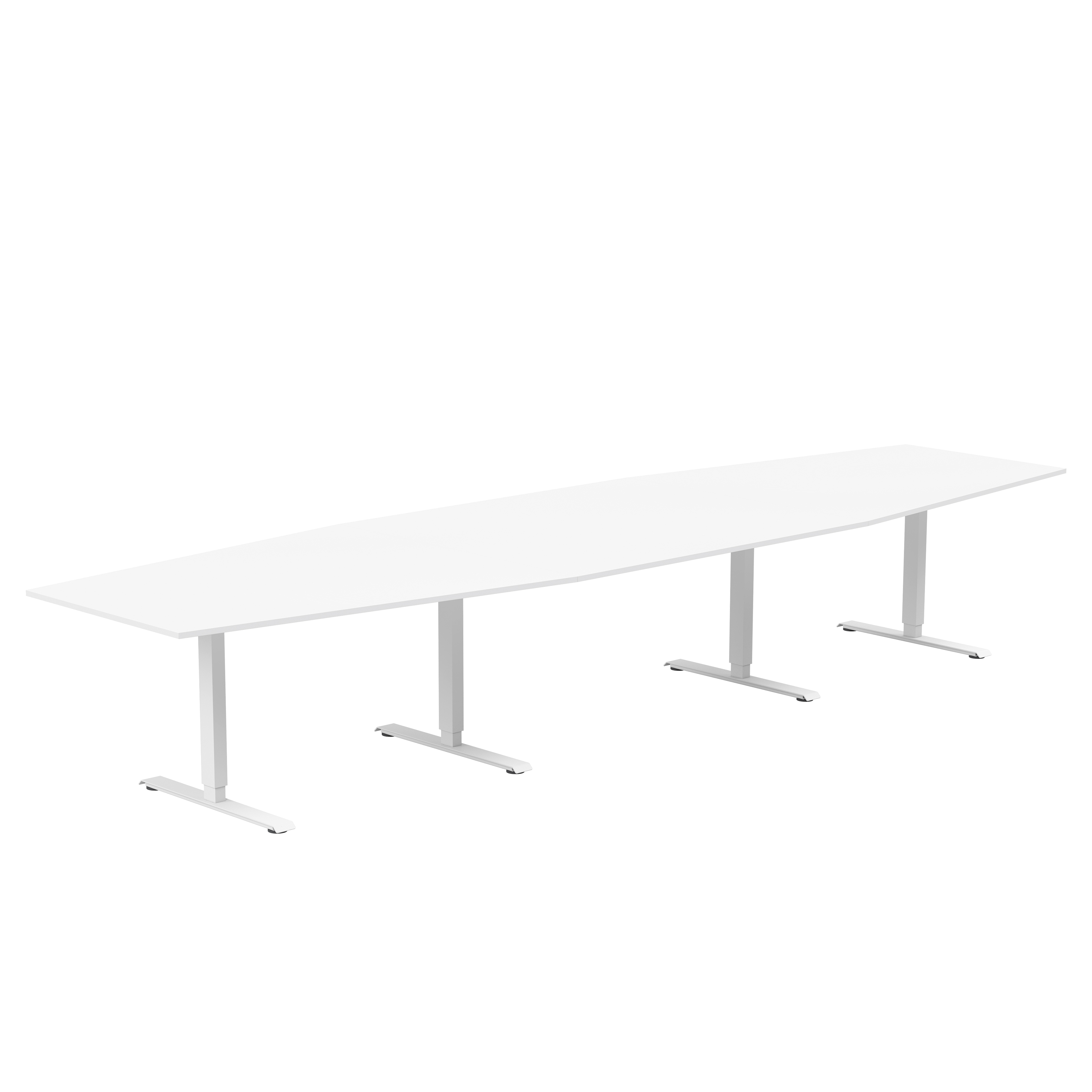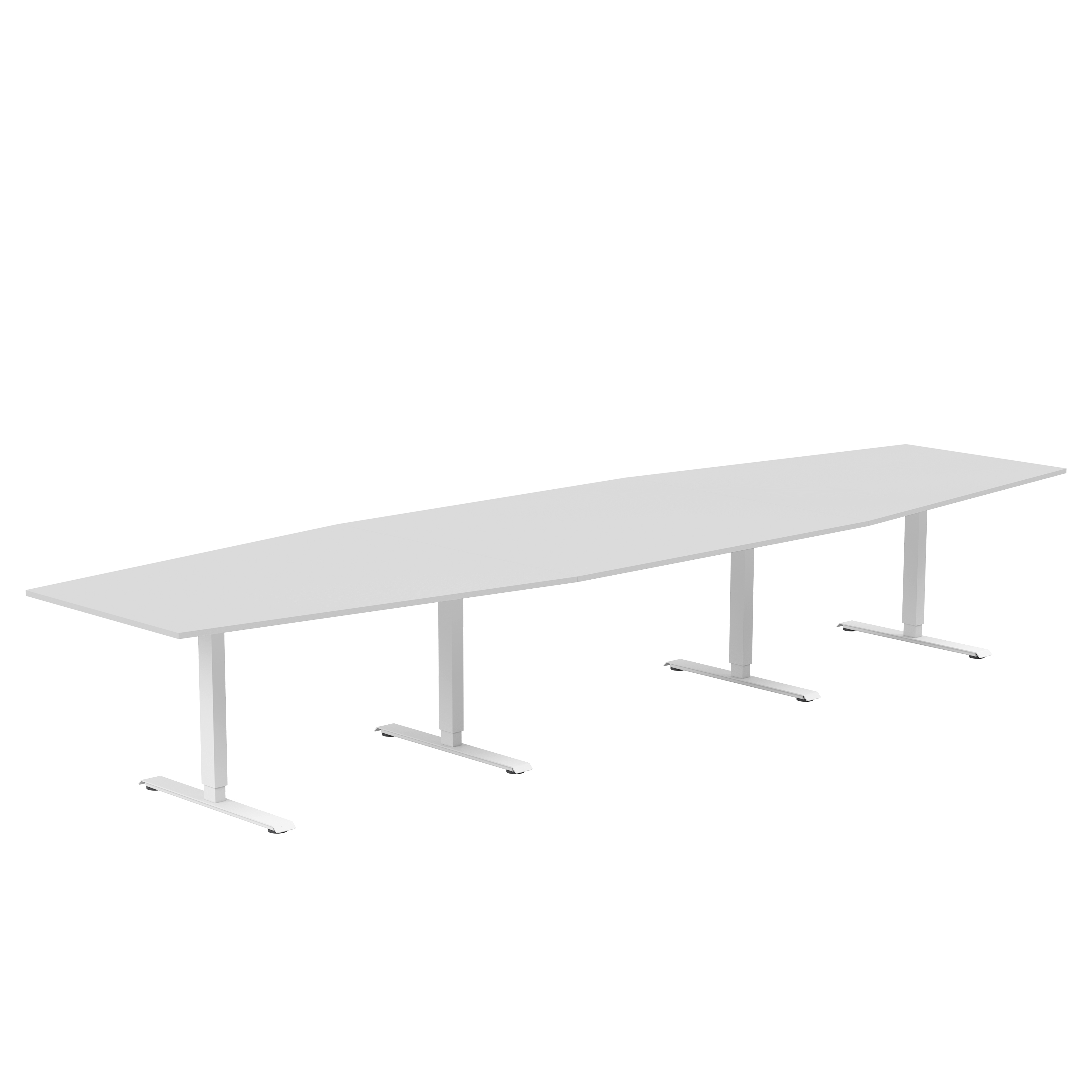 Båtformat konferensbord för cirka 14 personer. Bordet har en stilren design med rektangulärt T-stativ och finns med flera sorters bordsskivor och i tre stativfärger. Bordshöjden kan ställas in manuellt så arbetshöjden kan justeras om det behövs.