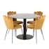 Matgrupp från Furniture Fashion. Runt matbord Ester med fot och rund centrumpelare i metall. Bordsskiva i svart marmor. Matstolar Limhamn Light med stomme och ben i svart metall. Hög rygg i en exklusivt utformad design. Ryggen och sitsen är i sammet. Lättare montering krävs.