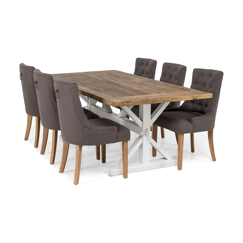 Matgrupp Lyon Natur/Vit 200x100 cm med 6 st Viktoria Stolar från In Living är en rustik matgrupp med massor av charm. Detta bord är rejält med bordsskiva i vintage almträ och vitt underrede i klassisk stil. Matbordet har mindre märken som tillför charm till möbeln och ger matbordet en naturlig look med genuin känsla. Fåtöljen Viktoria fångar blicken direkt med en iögonfallande design och exklusiva detaljer. Klassiskt knappklädd rygg, pärlspik, ringbeslag på baksidan, vinklade ben och vacker linneklädsel är karaktärsdrag för Viktoria. Den utmärkta sittkomforten bjuder in till långa och trevliga middagar.