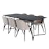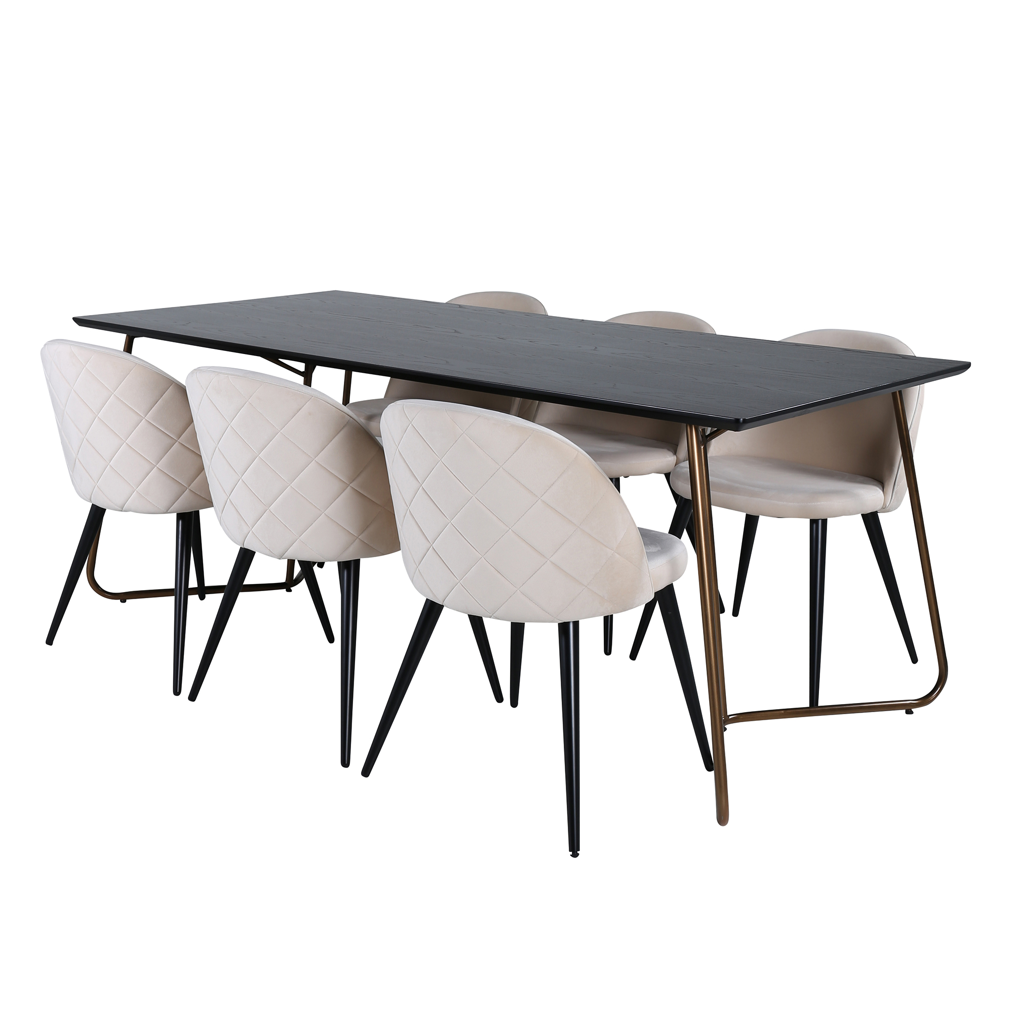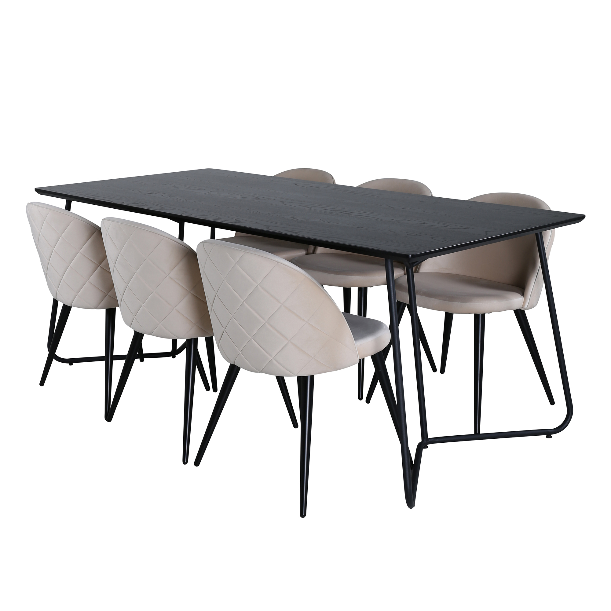 Matgrupp Annika från Venture Home. Med ett matbord i svart MDF med faner med svarta bordsben i järn. Matchas med 6 st Valentina stitcthes matstolar med dekorsöm och med svarta stolsben i järn och beigea sitsar i sammet.